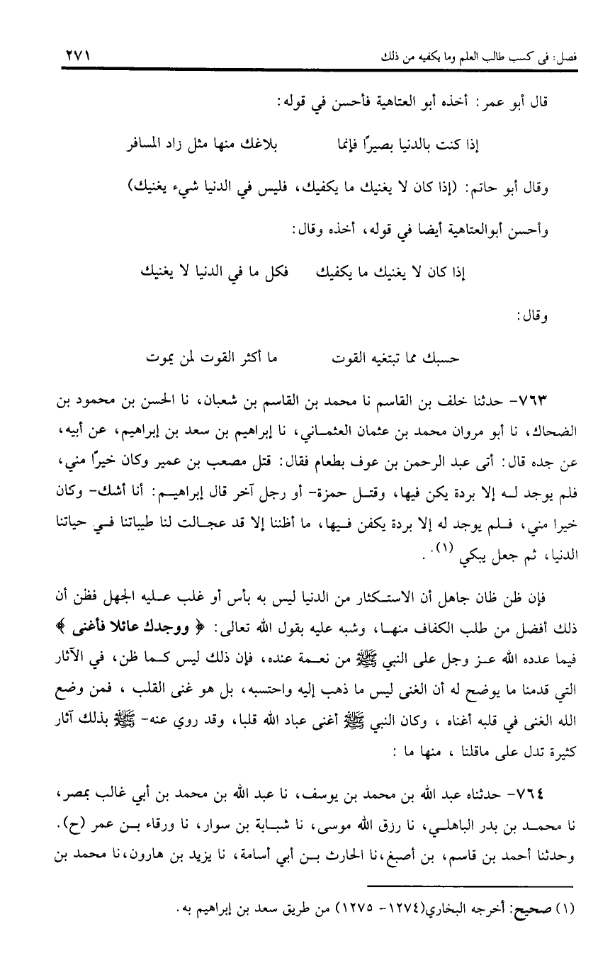 وقال أبو حاتم: (إذا كان لا يغنيك ما يكفيك، فليس في الدنيا شيء يغنيك) وأحسن أبو العتاهية أيضا في قوله، أخذه وقال: