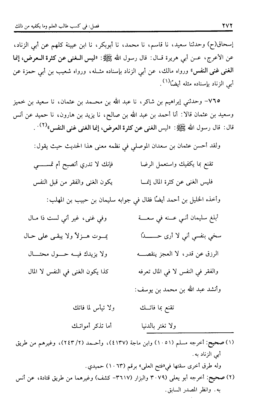 إسحاق (ح) وحدثنا سعيد، نا قاسم، نا محمد، نا أبو بكر، نا ابن عيينة كلهم عن أبي الزناد، عن الأعرج، عن أبي هريرة قال: قال رسول اللّه صلى اللّه عليه وسلم: «ليس الغنى عن كثرة العرض، إنما الغنى غنى النفس» ورواه مالك، عن أبي الزناد بإسناده مثله، ورواه شعيب بن أبي حمزة عن أبي الزناد بإسناده مثله أيضا.