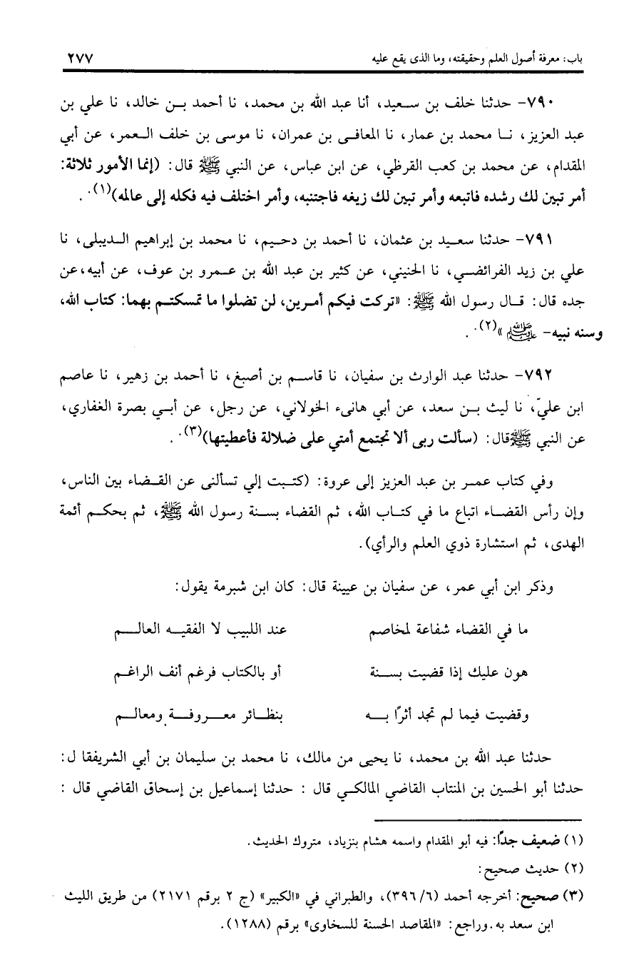 791 - حدثنا سعيد بن عثمان، نا أحمد بن دحيم، نا محمد بن إبراهيم الديبلى، نا علي بن زيد الفرائضي، نا الحنيني، عن كثير بن عبد اللّه بن عمرو بن عوف، عن أبيه، عن جده قال: قال رسول اللّه صلى اللّه عليه وسلم: «تركت فيكم أمرين، لن تضلوا ما تمسكتم بهما: كتاب اللّه، وسنه نبيه - صلى اللّه عليه وسلم».
