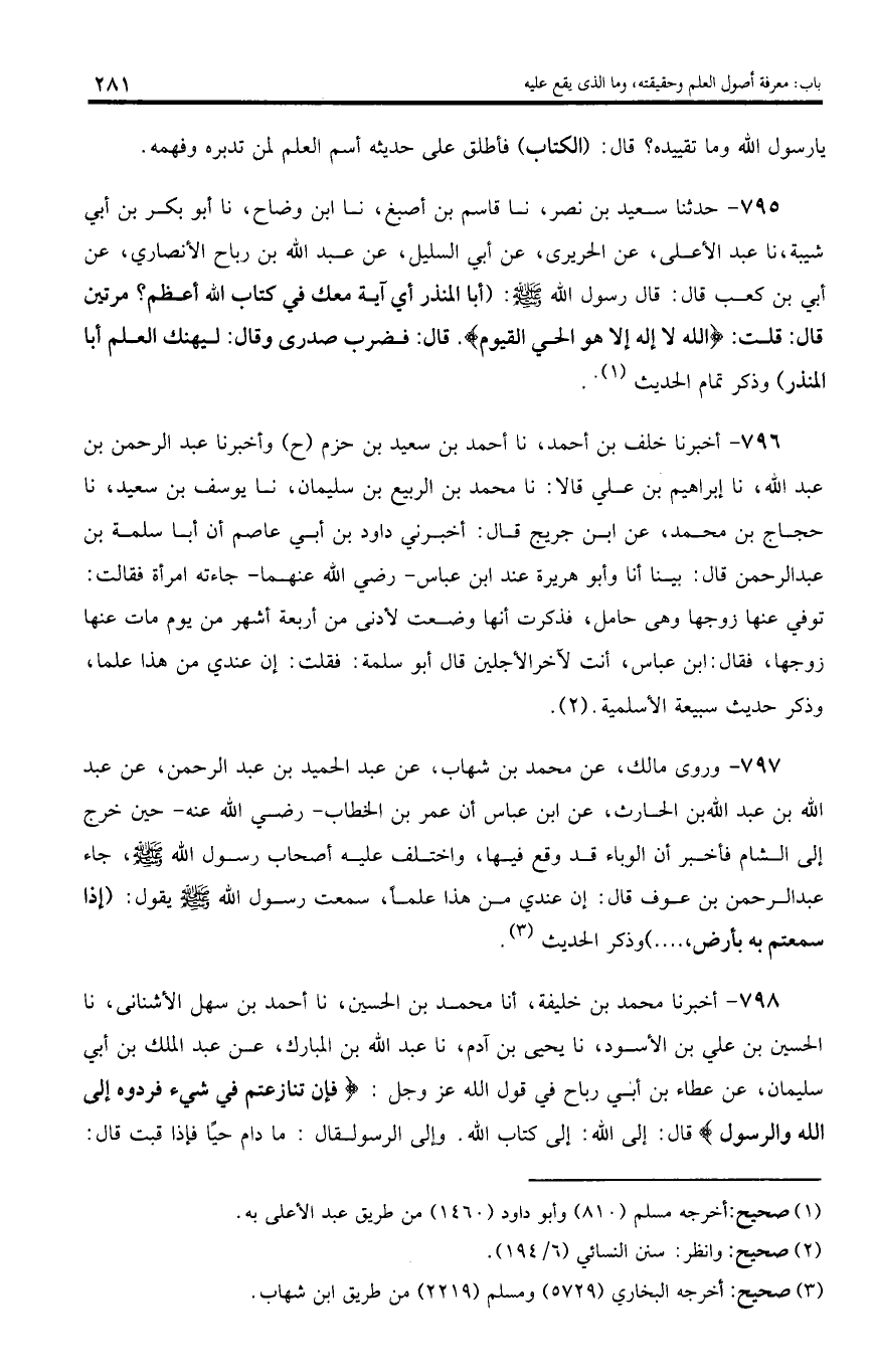 798 - أخبرنا محمد بن خليفة، أنا محمد بن الحسين، نا أحمد بن سهل الأشنانى، نا الحسين بن علي بن الأسود، نا يحيى بن آدم، نا عبد اللّه بن المبارك، عن عبد الملك بن أبي سليمان، عن عطاء بن أبي رباح في قول اللّه عز وجل: فَإِنْ تَنازَعْتُمْ فِي شَيْ ءٍ فَرُدُّوهُ إِلَى اللَّهِ وَالرَّسُولِ