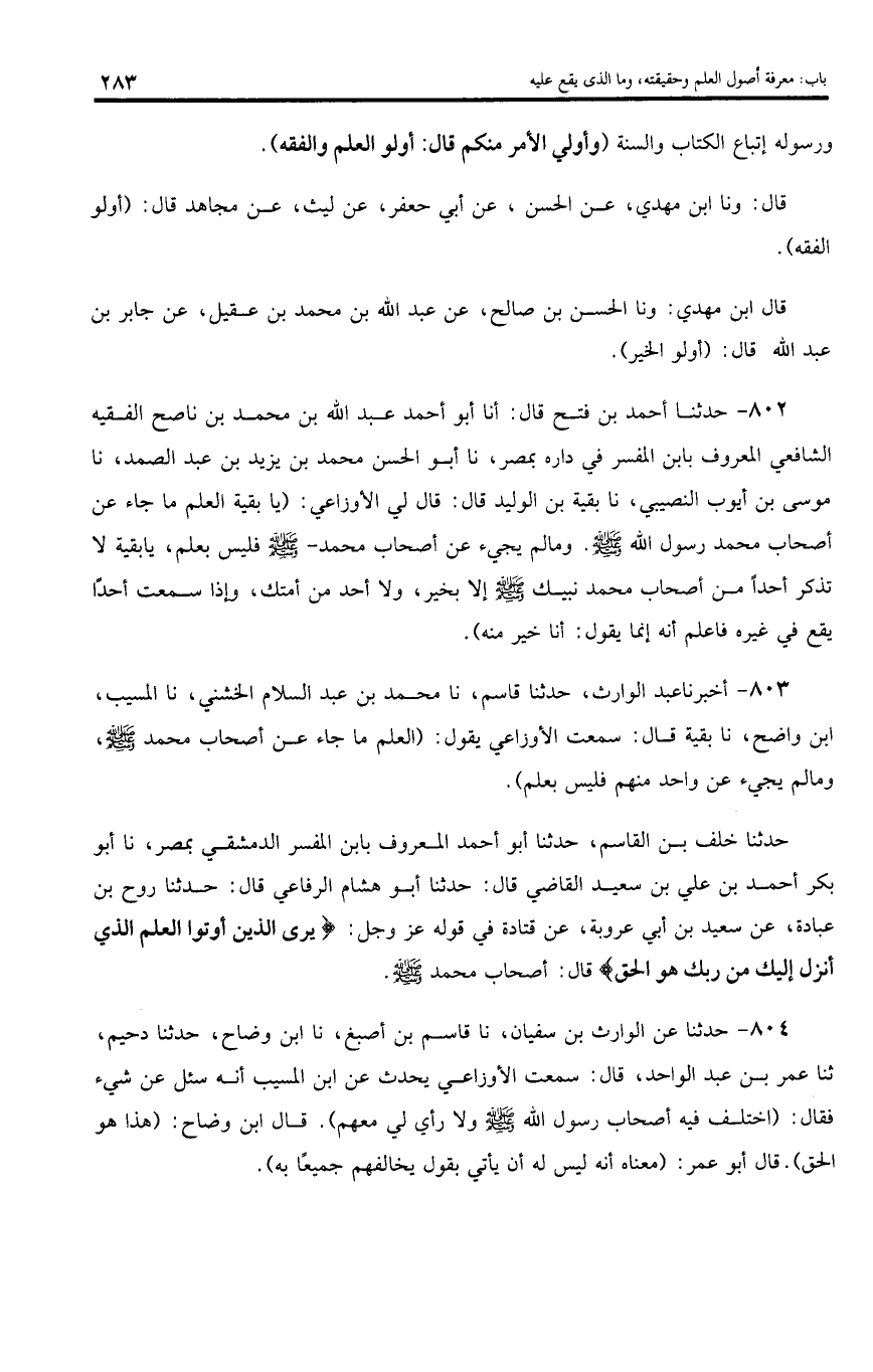 803 - أخبرنا عبد الوارث، حدثنا قاسم، نا محمد بن عبد السلام الخشني، نا المسيب، ابن واضح، نا بقية قال: سمعت الأوزاعي يقول: (العلم ما جاء عن أصحاب محمد صلى اللّه عليه وسلم، وما لم يجيء عن واحد منهم فليس بعلم).