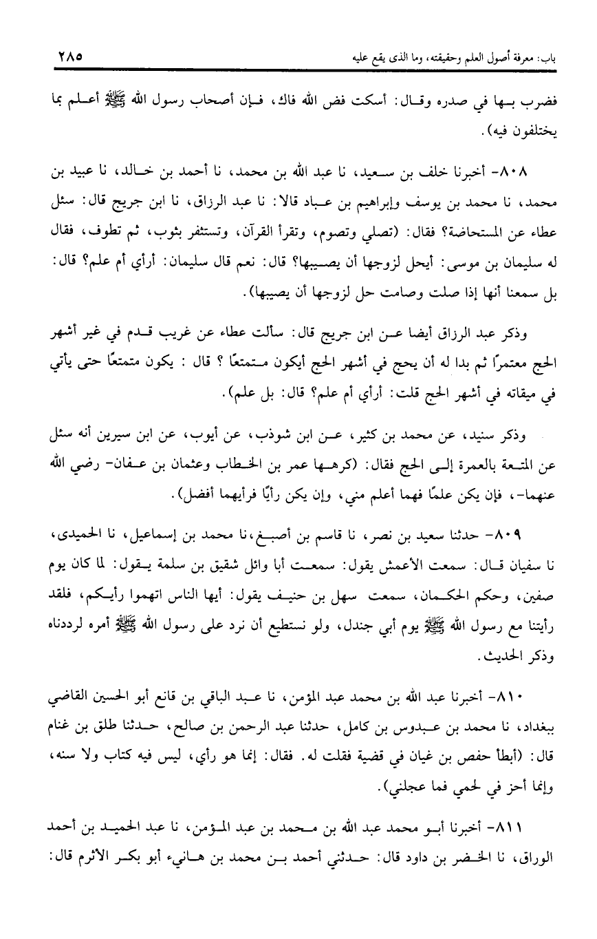 810 - أخبرنا عبد اللّه بن محمد عبد المؤمن، نا عبد الباقي بن قانع أبو الحسين القاضي ببغداد، نا محمد بن عبدوس بن كامل، حدثنا عبد الرحمن بن صالح، حدثنا طلق بن غنام قال: (أبطأ حفص بن غيان في قضية فقلت له. فقال: إنما هو رأي، ليس فيه كتاب ولا سنه، وإنما أحز في لحمي فما عجلني).