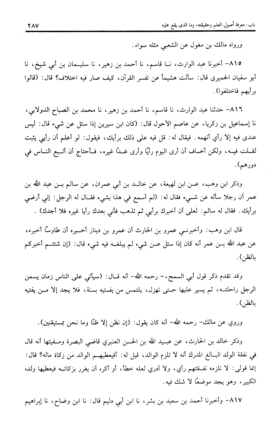 815 - أخبرنا عبد الوارث، نا قاسم، نا أحمد بن زهير، نا سليمان بن أبي شيخ، نا أبو سفيان الحميري قال: سألت هشيما عن تفسر القرآن، كيف صار فيه اختلاف؟ قال: (قالوا برأيهم فاختلفوا).