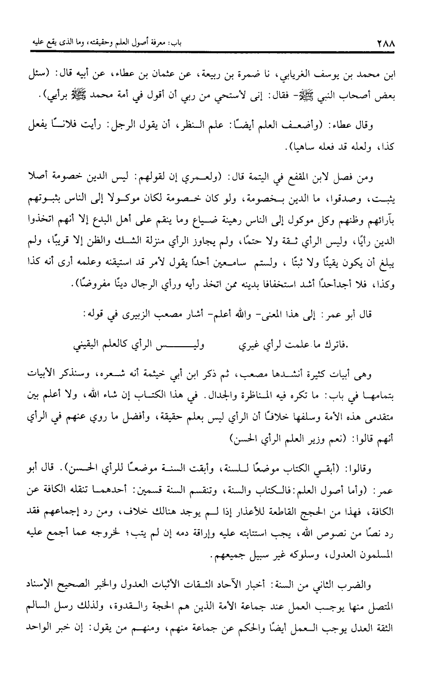 وهى أبيات كثيرة أنشدها مصعب، ثم ذكر ابن أبي خيثمة أنه شعره، وسنذكر الأبيات بتمامها في باب: ما تكره فيه المناظرة والجدال. في هذا الكتاب إن شاء اللّه، ولا أعلم بين متقدمى هذه الأمة وسلفها خلافا أن الرأي ليس بعلم حقيقة، وأفضل ما روي عنهم في الرأي أنهم قالوا: (نعم وزير العلم الرأي الحسن).