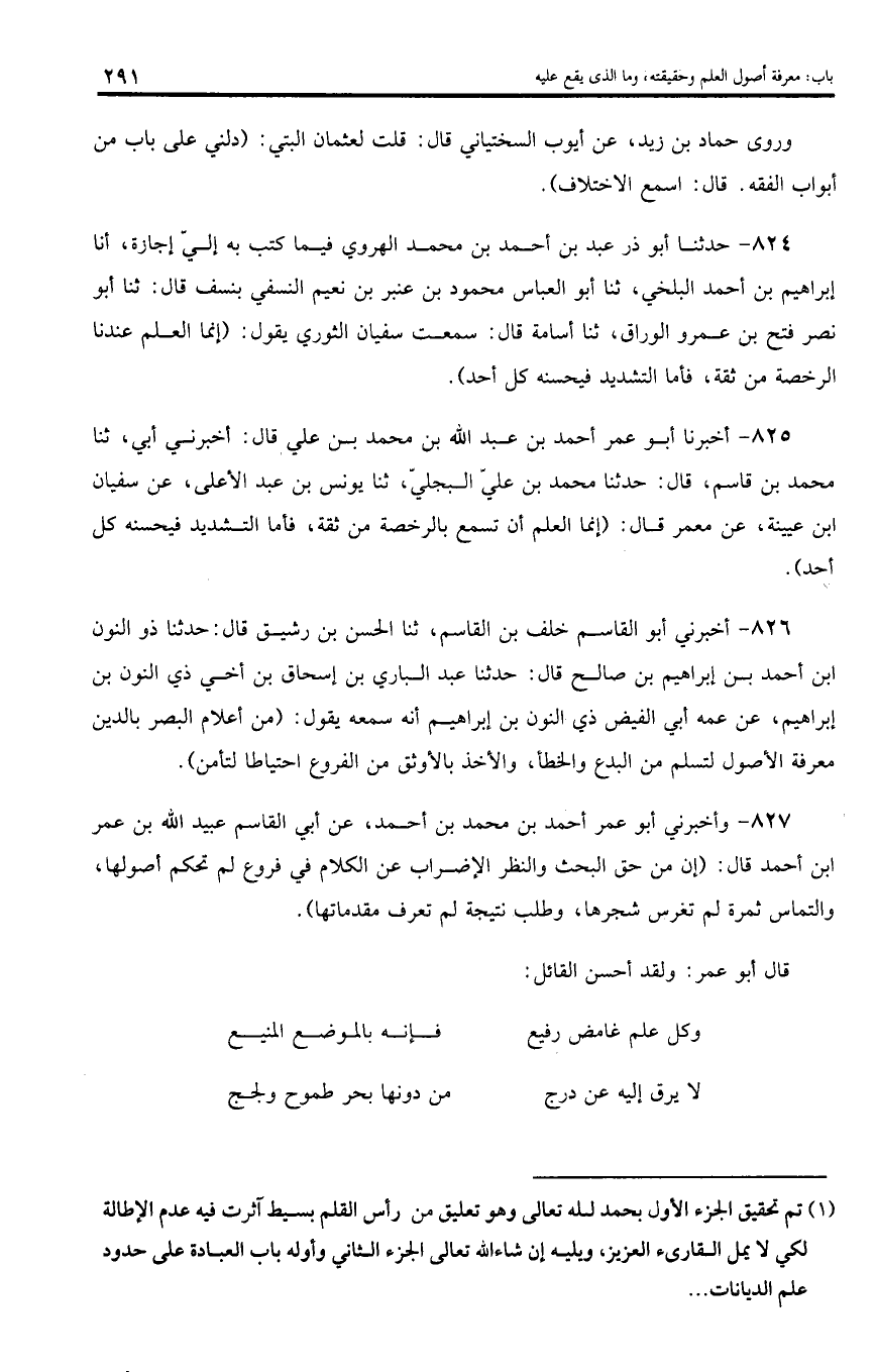 824 - حدثنا أبو ذر عبد بن أحمد بن محمد الهروي فيما كتب به إليّ إجازة، أنا إبراهيم بن أحمد البلخي، ثنا أبو العباس محمود بن عنبر بن نعيم النسفي بنسف قال: ثنا أبو نصر فتح بن عمرو الوراق، ثنا أسامة قال: سمعت سفيان الثوري يقول: (إنما العلم عندنا الرخصة من ثقة، فأما التشديد فيحسنه كل أحد).