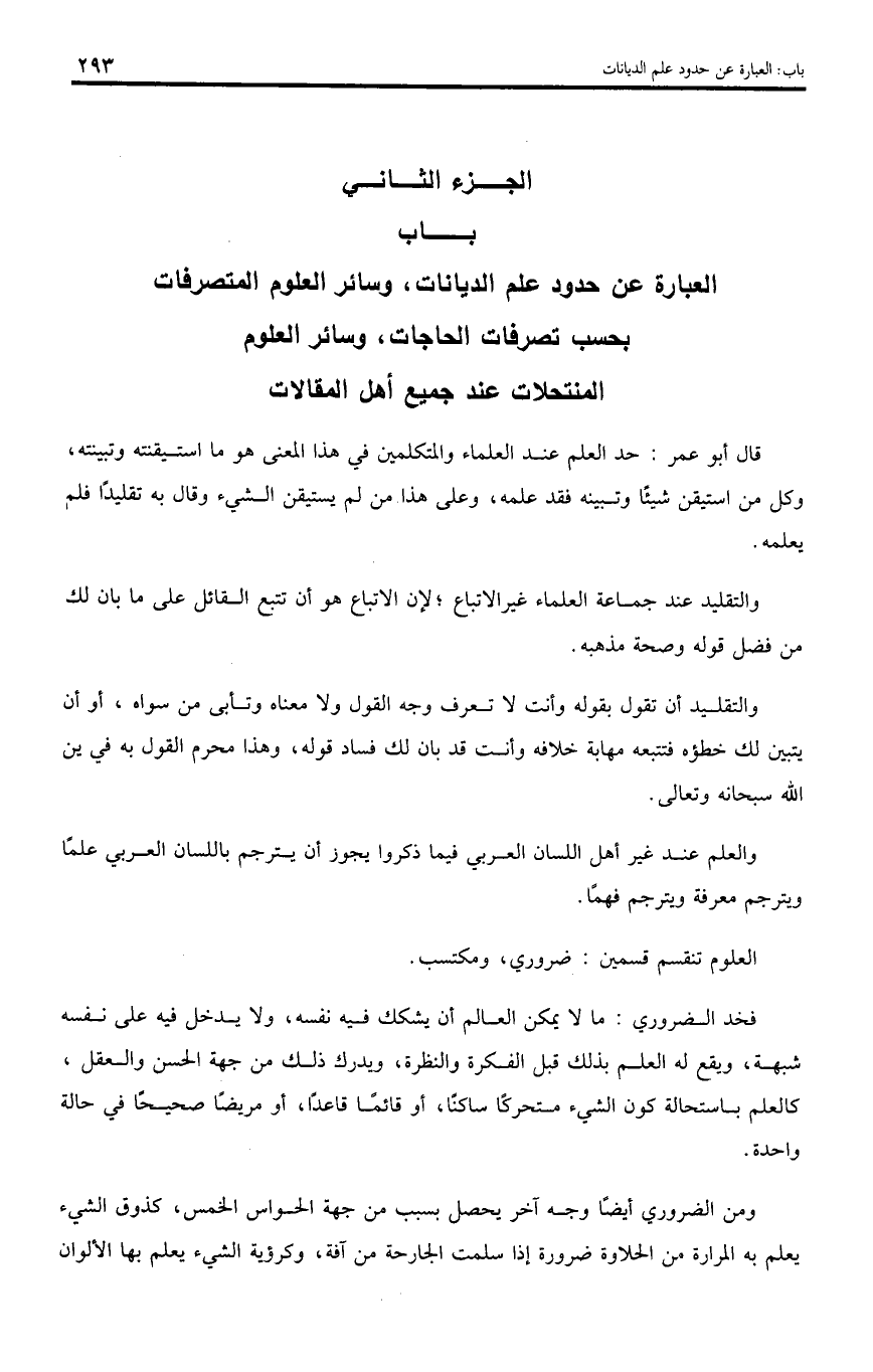 باب العبارة عن حدود علم الديانات، وسائر العلوم المتصرفات بحسب تصرفات الحاجات، وسائر العلوم المنتحلات عند جميع أهل المقالات