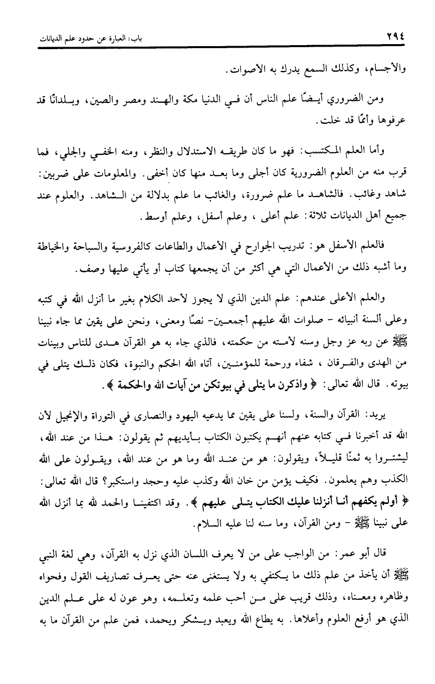 والعلم الأعلى عندهم: علم الدين الذي لا يجوز لأحد الكلام بغير ما أنزل اللّه في كتبه وعلى ألسنة أنبيائه - صلوات اللّه عليهم أجمعين - نصا ومعنى، ونحن على يقين مما جاء نبينا صلى اللّه عليه وسلم عن ربه عز وجل وسنه لأمته من حكمته، فالذي جاء به هو القرآن هدى للناس وبينات من الهدى والفرقان، شفاء ورحمة للمؤمنين، آتاه اللّه الحكم والنبوة، فكان ذلك يتلى في بيوته. قال اللّه تعالى: وَاذْكُرْنَ ما يُتْلى فِي بُيُوتِكُنَّ مِنْ آياتِ اللَّهِ وَالْحِكْمَةِ