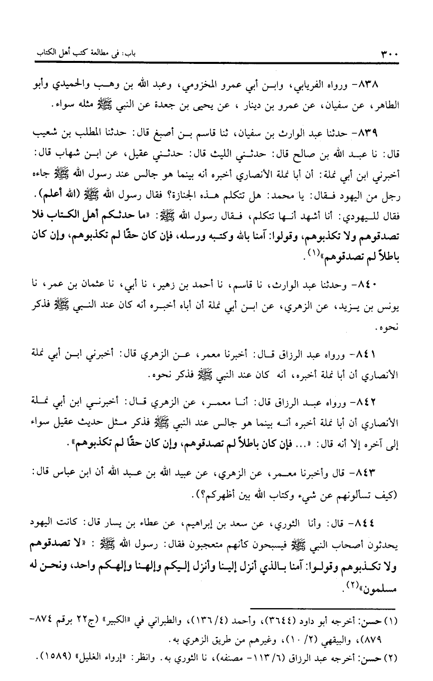 844 - قال: وأنا الثوري، عن سعد بن إبراهيم، عن عطاء بن يسار قال: كانت اليهود يحدثون أصحاب النبي صلى اللّه عليه وسلم فيسبحون كأنهم متعجبون فقال: رسول اللّه صلى اللّه عليه وسلم: «لا تصدقوهم ولا تكذبوهم وقولوا: آمنا بالذي أنزل إلينا وأنزل إليكم وإلهنا وإلهكم واحد، ونحن له مسلمون».