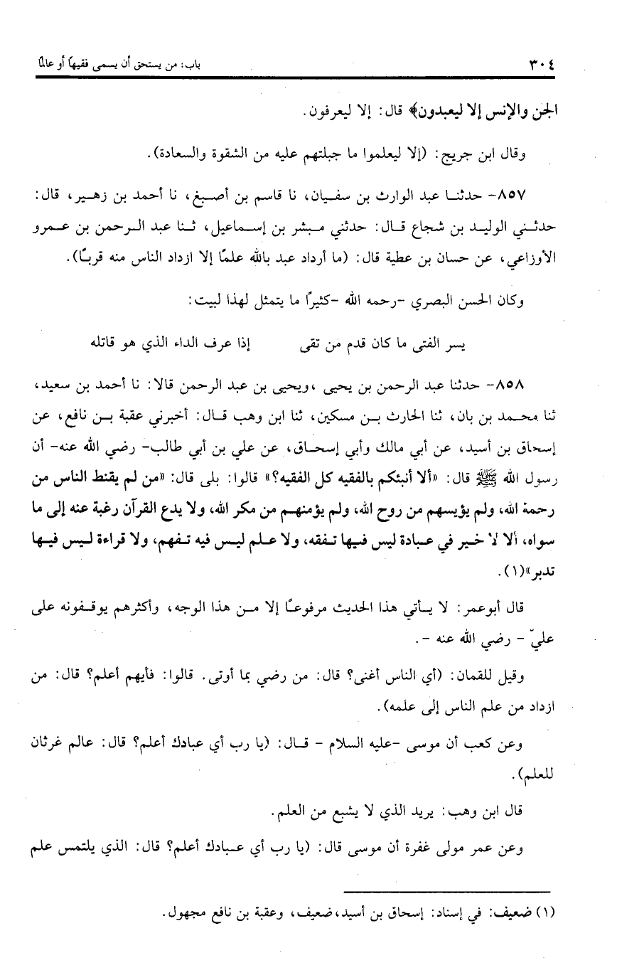 858 - حدثنا عبد الرحمن بن يحيى، ويحيى بن عبد الرحمن قالا: نا أحمد بن سعيد، ثنا محمد بن بان، ثنا الحارث بن مسكين، ثنا ابن وهب قال: أخبرني عقبة بن نافع، عن إسحاق بن أسيد، عن أبي مالك وأبي إسحاق، عن علي بن أبي طالب - رضي اللّه عنه - أن رسول اللّه صلى اللّه عليه وسلم قال: «أ لا أنبئكم بالفقيه كل الفقيه؟» قالوا: بلى قال: «من لم يقنط الناس من رحمة اللّه، ولم يؤيسهم من روح اللّه، ولم يؤمنهم من مكر اللّه، ولا يدع القرآن رغبة عنه إلى ما سواه، ألا لا خير في عبادة ليس فيها تفقه، ولا علم ليس فيه تفهم، ولا قراءة ليس فيها تدبر».