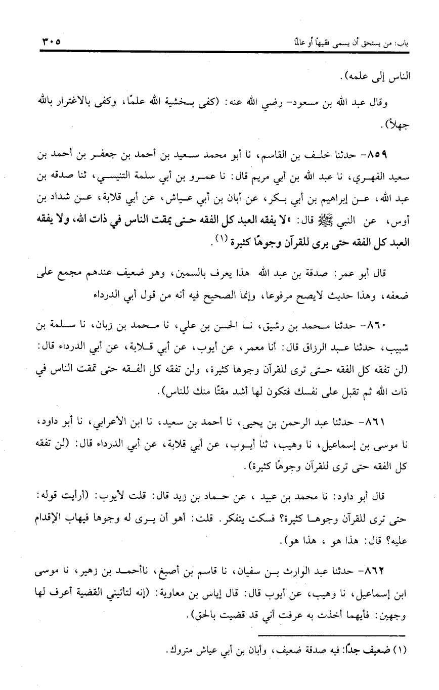 861 - حدثنا عبد الرحمن بن يحيى، نا أحمد بن سعيد، نا ابن الأعرابي، نا أبو داود، نا موسى بن إسماعيل، نا وهيب، ثنا أيوب، عن أبي قلابة، عن أبي الدرداء قال: (لن تفقه كل الفقه حتى ترى للقرآن وجوها كثيرة).
