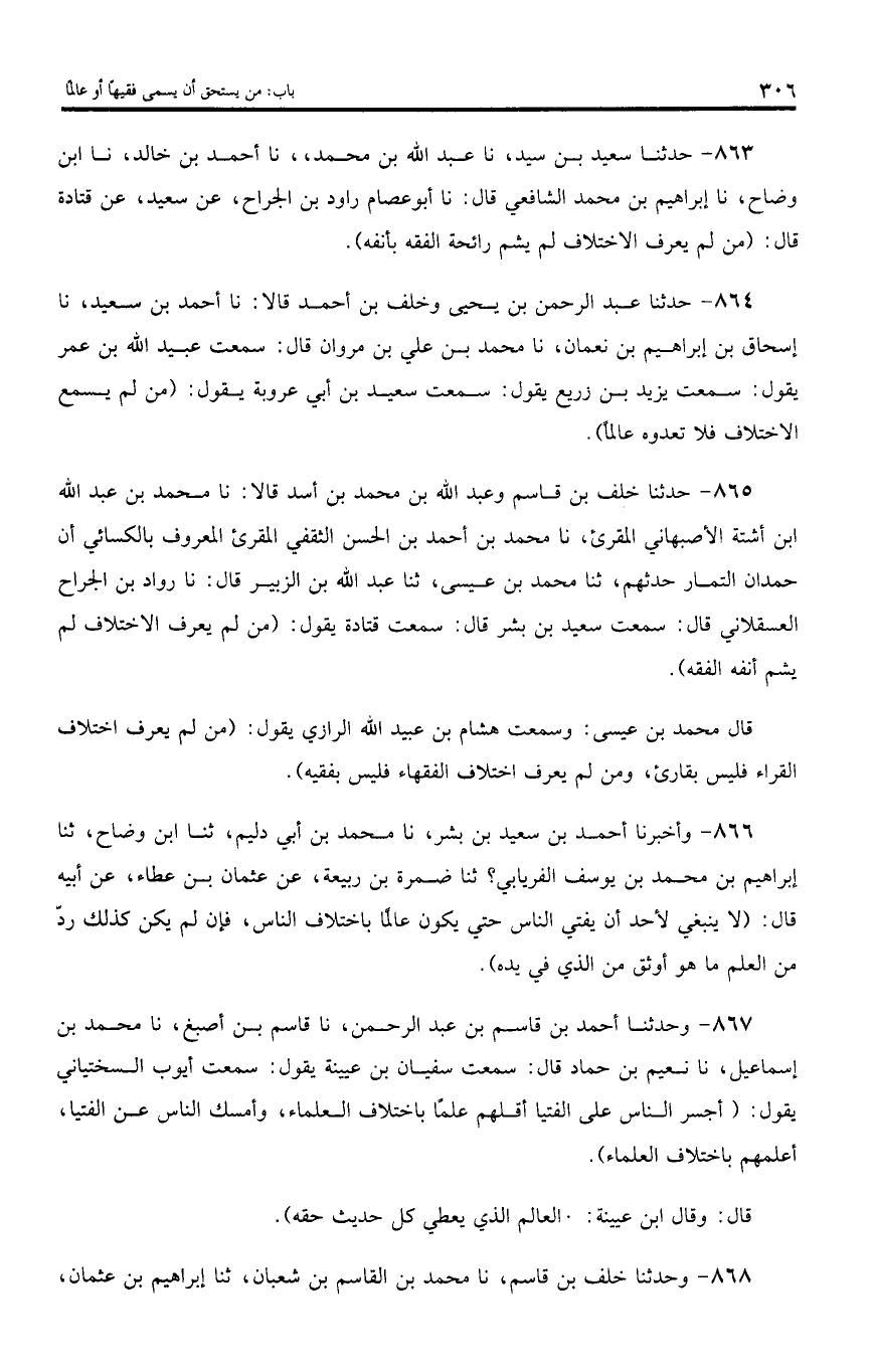 864 - حدثنا عبد الرحمن بن يحيى وخلف بن أحمد قالا: نا أحمد بن سعيد، نا إسحاق بن إبراهيم بن نعمان، نا محمد بن علي بن مروان قال: سمعت عبيد اللّه بن عمر يقول: سمعت يزيد بن زريع يقول: سمعت سعيد بن أبي عروبة يقول: (من لم يسمع الاختلاف فلا تعدوه عالما).