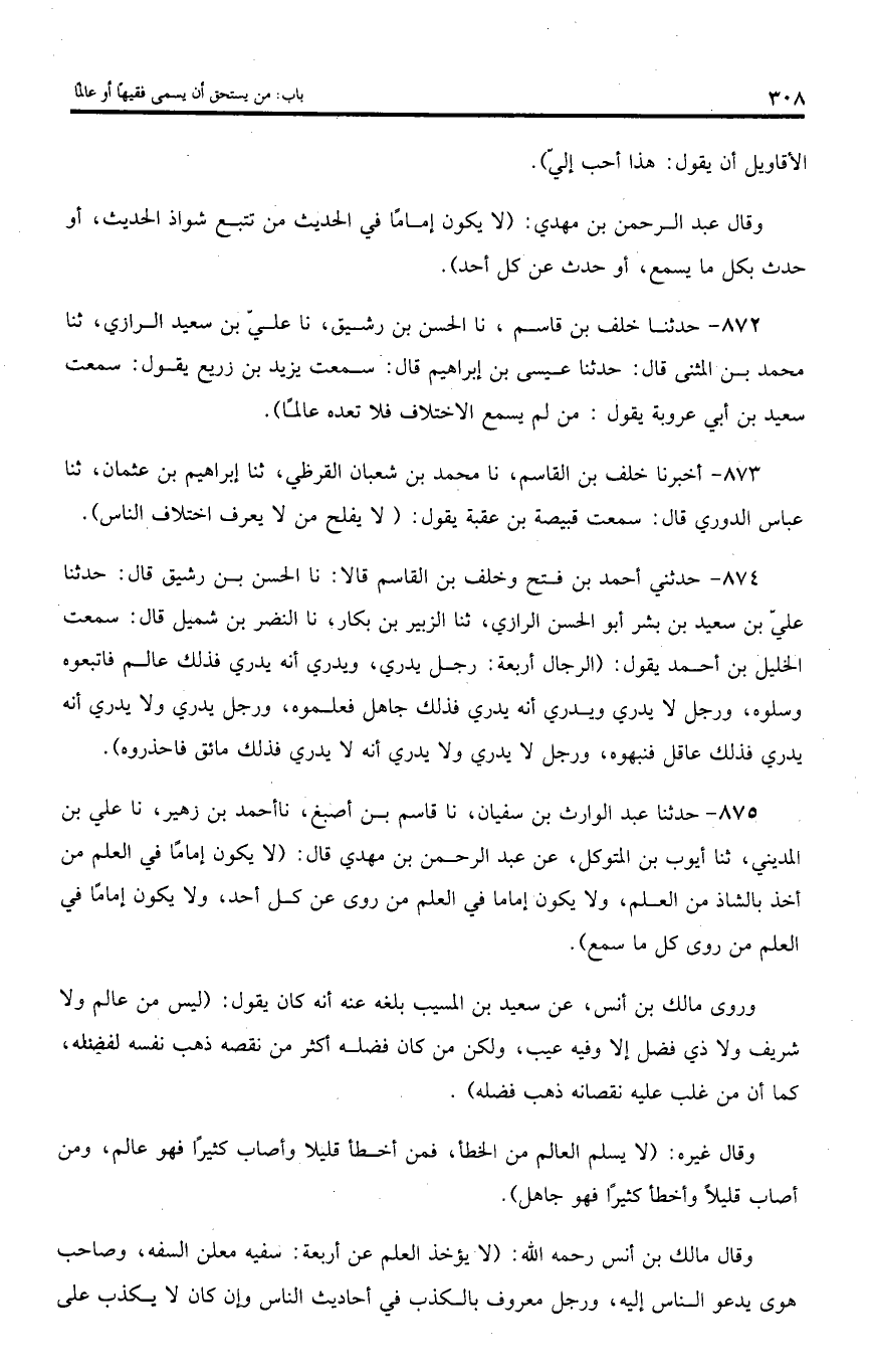 875 - حدثنا عبد الوارث بن سفيان، نا قاسم بن أصبغ، نا أحمد بن زهير، نا علي بن المديني، ثنا أيوب بن المتوكل، عن عبد الرحمن بن مهدي قال: (لا يكون إماما في العلم من أخذ بالشاذ من العلم، ولا يكون إماما في العلم من روى عن كل أحد، ولا يكون إماما في العلم من روى كل ما سمع).