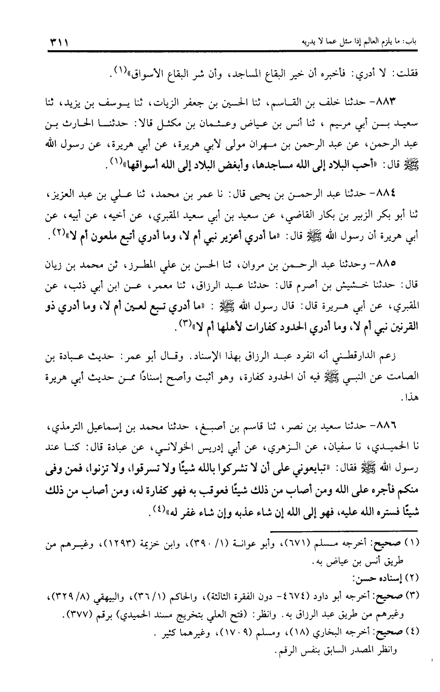 886 - حدثنا سعيد بن نصر، ثنا قاسم بن أصبغ، حدثنا محمد بن إسماعيل الترمذي، نا الحميدي، نا سفيان، عن الزهري، عن أبي إدريس الخولاني، عن عبادة قال: كنا عند رسول اللّه صلى اللّه عليه وسلم فقال: «تبايعوني على أن لا تشركوا بالله شيئا ولا تسرقوا، ولا تزنوا، فمن وفى منكم فأجره على اللّه ومن أصاب من ذلك شيئا فعوقب به فهو كفارة له، ومن أصاب من ذلك شيئا فستره اللّه عليه، فهو إلى اللّه إن شاء عذبه وإن شاء غفر له».
