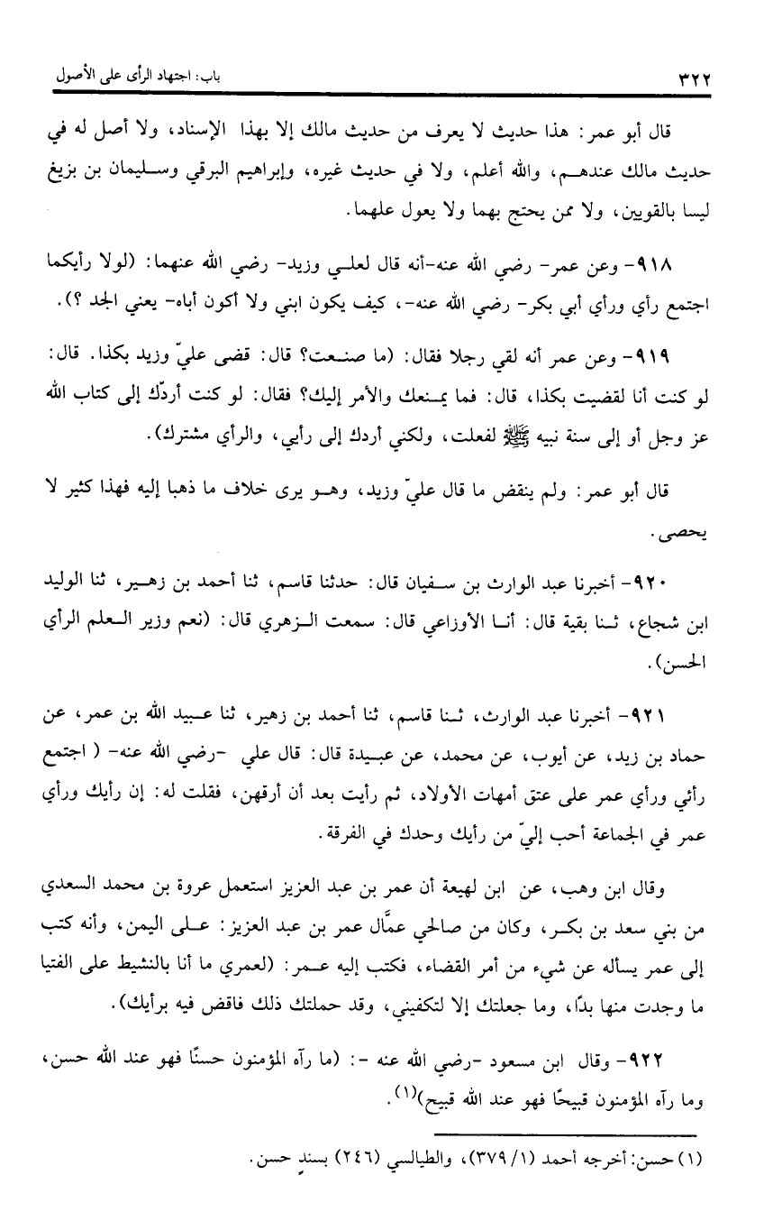 922 - وقال ابن مسعود - رضي اللّه عنه -: (ما رآه المؤمنون حسنا فهو عند اللّه حسن، وما رآه المؤمنون قبيحا فهو عند اللّه قبيح).