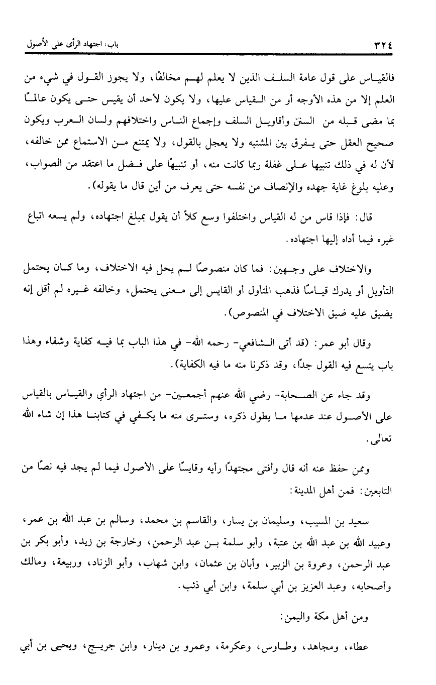 فالقياس على قول عامة السلف الذين لا يعلم لهم مخالفا، ولا يجوز القول في شيء من العلم إلا من هذه الأوجه أو من القياس عليها، ولا يكون لأحد أن يقيس حتى يكون عالما بما مضى قبله من السنن وأقاويل السلف وإجماع الناس واختلافهم ولسان العرب ويكون صحيح العقل حتى يفرق بين المشتبه ولا يعجل بالقول، ولا يمتنع من الاستماع ممن خالفه، لأن له في ذلك تنبيها على غفلة ربما كانت منه، أو تنبيها على فضل ما اعتقد من الصواب، وعليه بلوغ غاية جهده والإنصاف من نفسه حتى يعرف من أين قال ما يقوله).