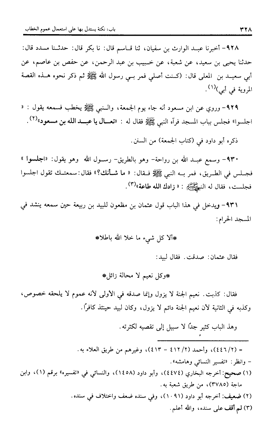 931 - ويدخل في هذا الباب قول عثمان بن مظعون للبيد بن ربيعة حين سمعه ينشد في المسجد الحرام: