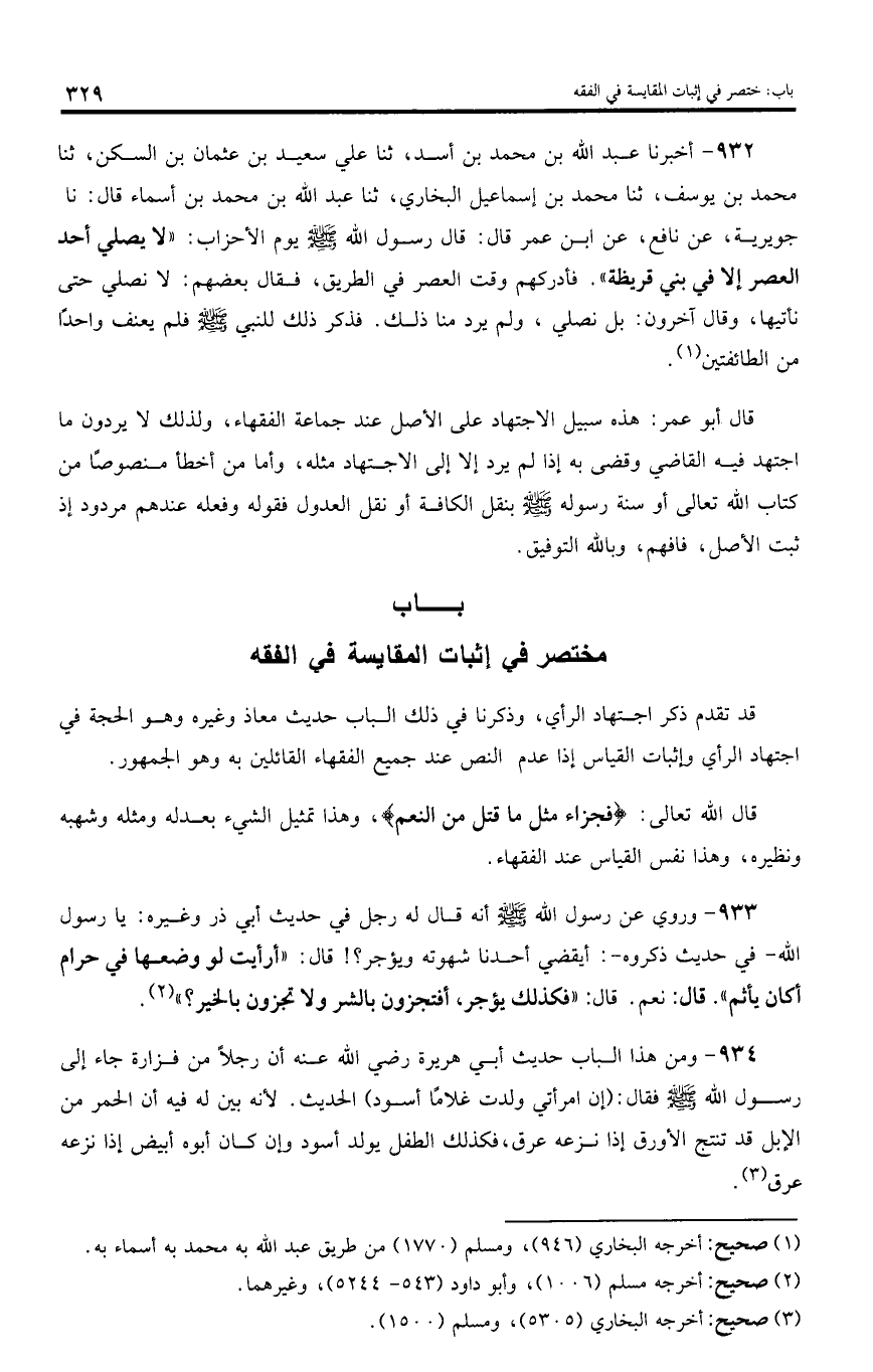 932 - أخبرنا عبد اللّه بن محمد بن أسد، ثنا علي سعيد بن عثمان بن السكن، ثنا محمد بن يوسف، ثنا محمد بن إسماعيل البخاري، ثنا عبد اللّه بن محمد بن أسماء قال: نا جويرية، عن نافع، عن ابن عمر قال: قال رسول اللّه صلى اللّه عليه وسلم يوم الأحزاب: «لا يصلي أحد العصر إلا في بني قريظة». فأدركهم وقت العصر في الطريق، فقال بعضهم: لا نصلي حتى نأتيها، وقال آخرون: بل نصلي، ولم يرد منا ذلك. فذكر ذلك للنبي صلى اللّه عليه وسلم فلم يعنف واحدا من الطائفتين.