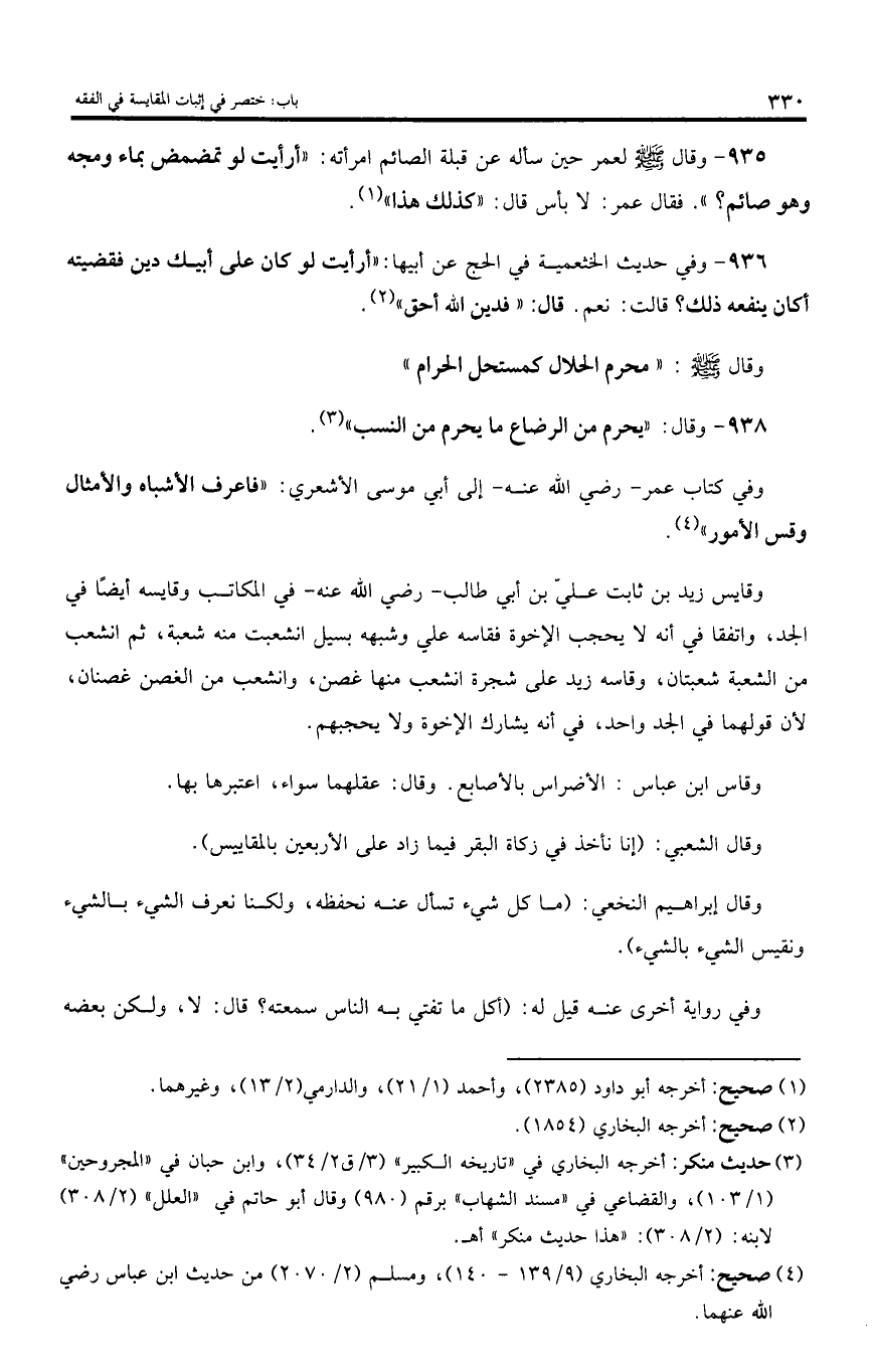 وفي كتاب عمر - رضي اللّه عنه - إلى أبي موسى الأشعري: «فاعرف الأشباه والأمثال وقس الأمور».
