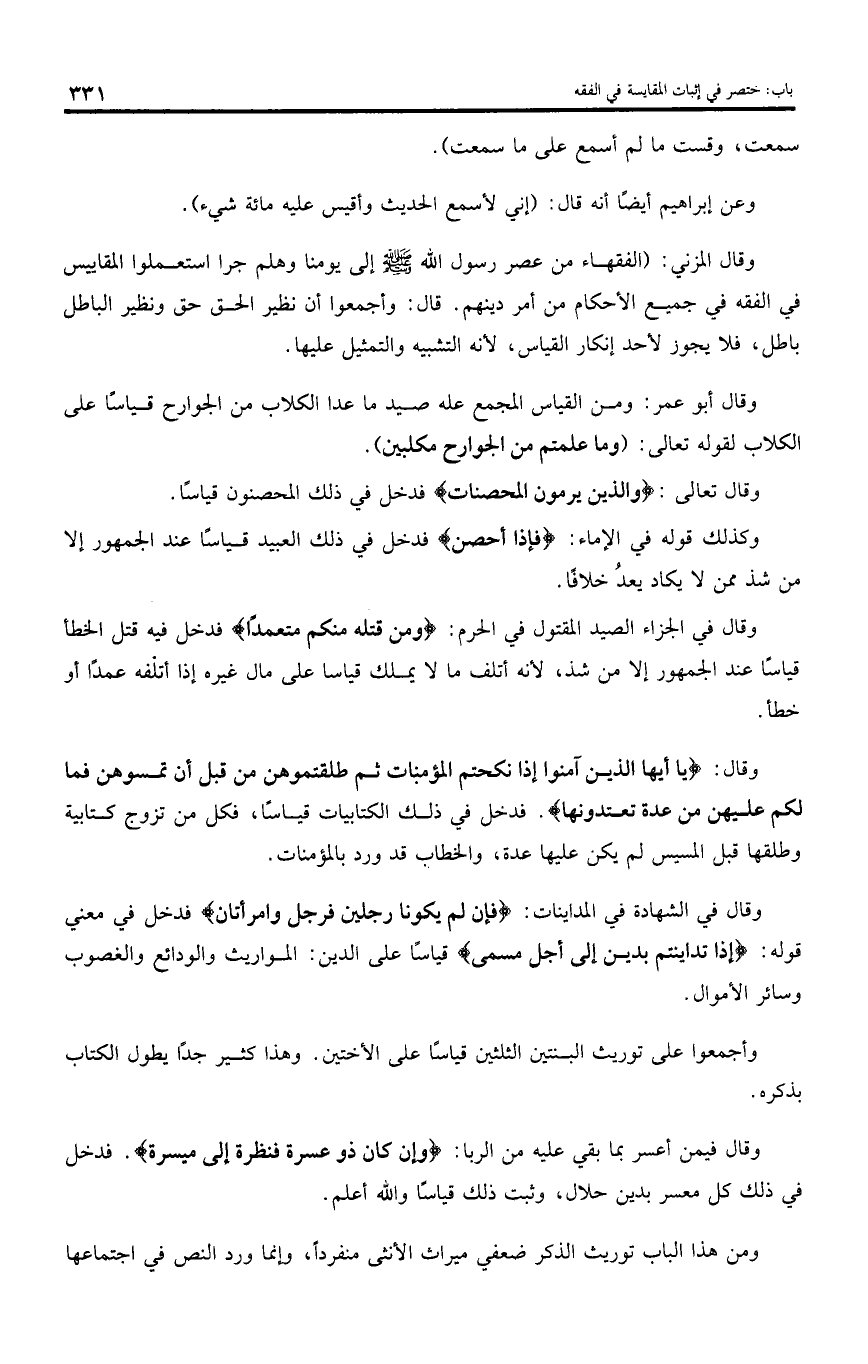 وقال المزني: (الفقهاء من عصر رسول اللّه صلى اللّه عليه وسلم إلى يومنا وهلم جرا استعملوا المقاييس في الفقه في جميع الأحكام من أمر دينهم. قال: وأجمعوا أن نظير الحق حق ونظير الباطل باطل، فلا يجوز لأحد إنكار القياس، لأنه التشبيه والتمثيل عليها.