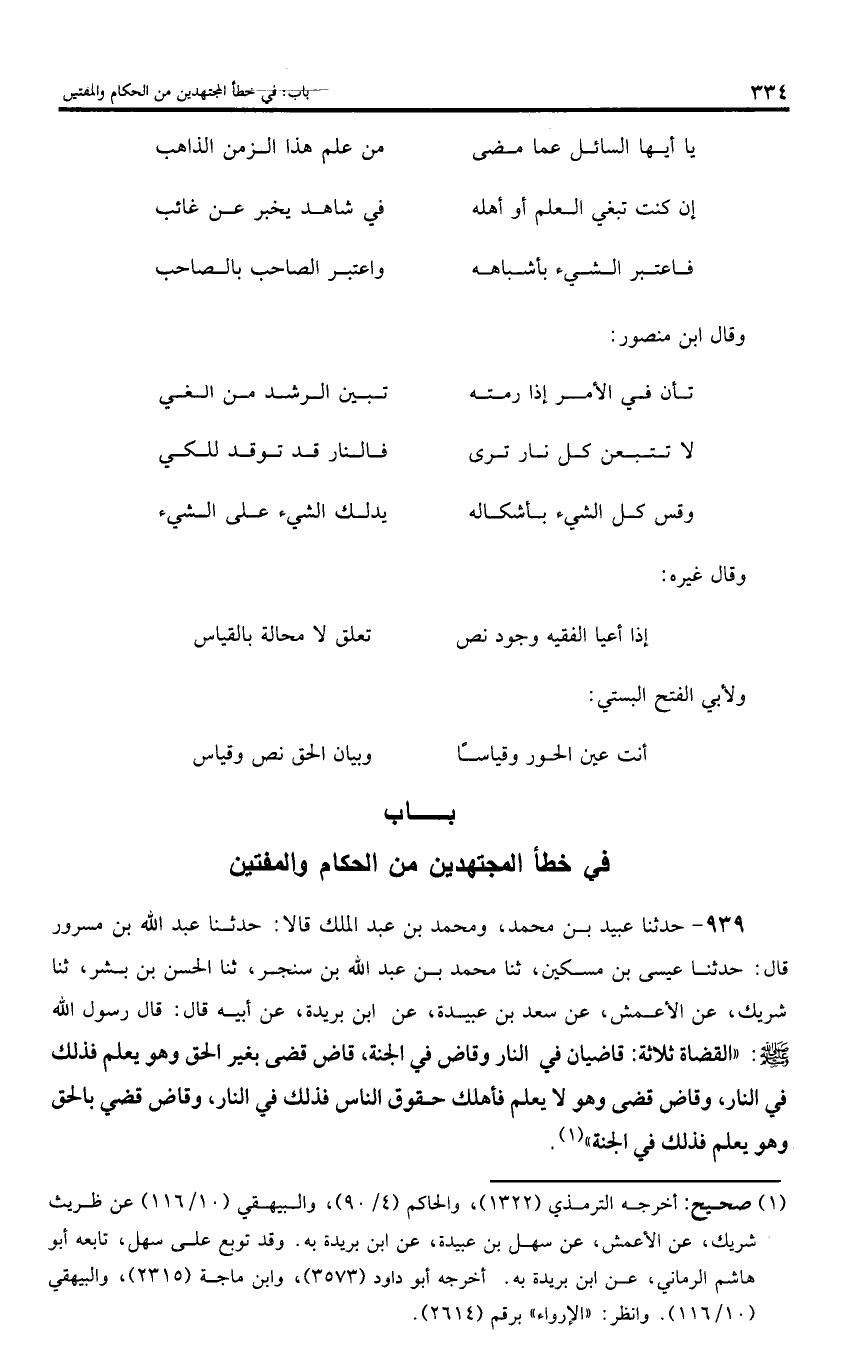939 - حدثنا عبيد بن محمد، ومحمد بن عبد الملك قالا: حدثنا عبد اللّه بن مسرور قال: حدثنا عيسى بن مسكين، ثنا محمد بن عبد اللّه بن سنجر، ثنا الحسن بن بشر، ثنا شريك، عن الأعمش، عن سعد بن عبيدة، عن ابن بريدة، عن أبيه قال: قال رسول اللّه صلى اللّه عليه وسلم: «القضاة ثلاثة: قاضيان في النار وقاض في الجنة، قاض قضى بغير الحق وهو يعلم فذلك في النار، وقاض قضى وهو لا يعلم فأهلك حقوق الناس فذلك في النار، وقاض قضي بالحق وهو يعلم فذلك في الجنة».