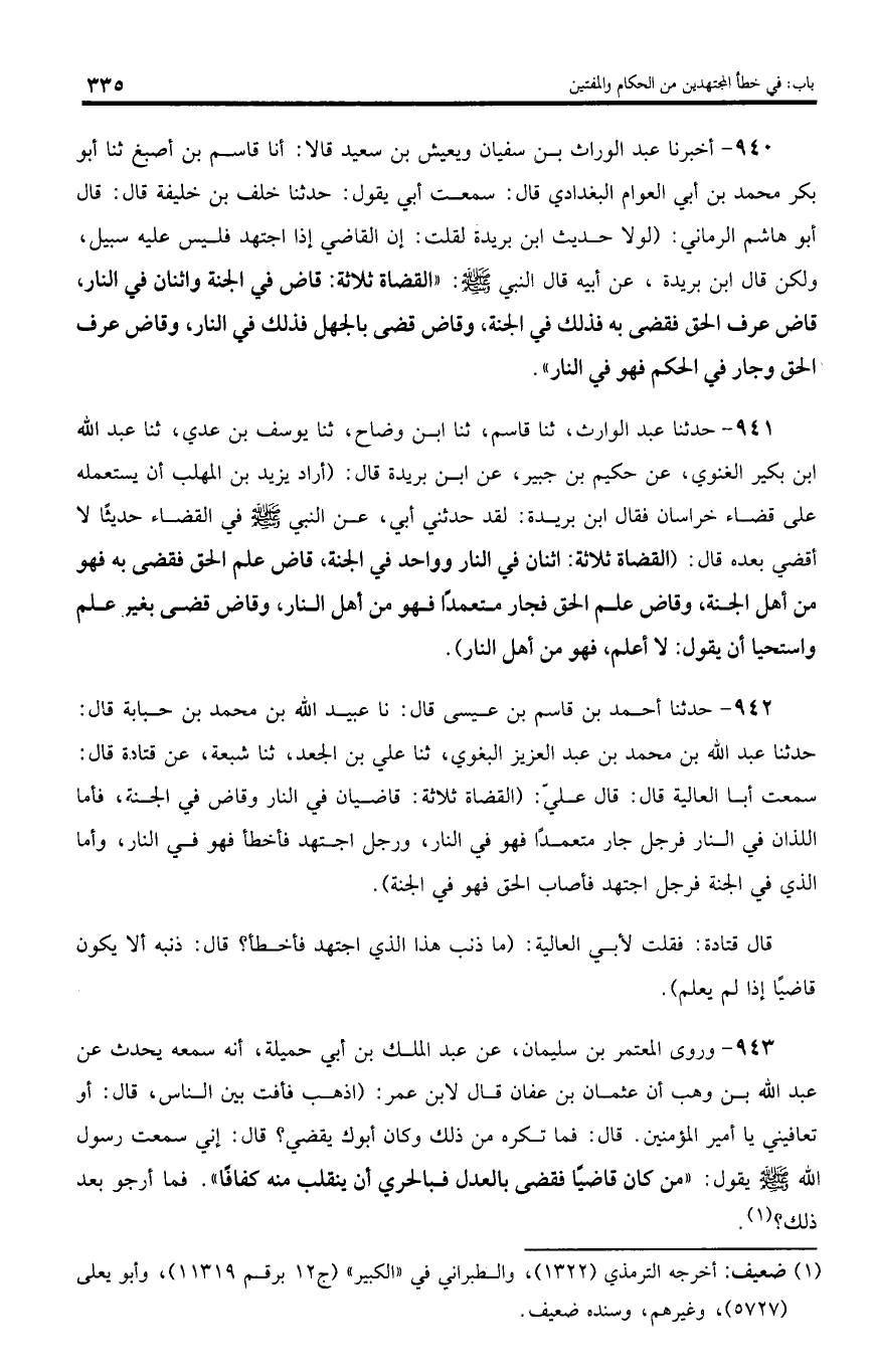 940 - أخبرنا عبد الوراث بن سفيان ويعيش بن سعيد قالا: أنا قاسم بن أصبغ ثنا أبو بكر محمد بن أبي العوام البغدادي قال: سمعت أبي يقول: حدثنا خلف بن خليفة قال: قال أبو هاشم الرماني: (لولا حديث ابن بريدة لقلت: إن القاضي إذا اجتهد فليس عليه سبيل، ولكن قال ابن بريدة، عن أبيه قال النبي صلى اللّه عليه وسلم: «القضاة ثلاثة: قاض في الجنة واثنان في النار، قاض عرف الحق فقضى به فذلك في الجنة، وقاض قضى بالجهل فذلك في النار، وقاض عرف الحق وجار في الحكم فهو في النار».