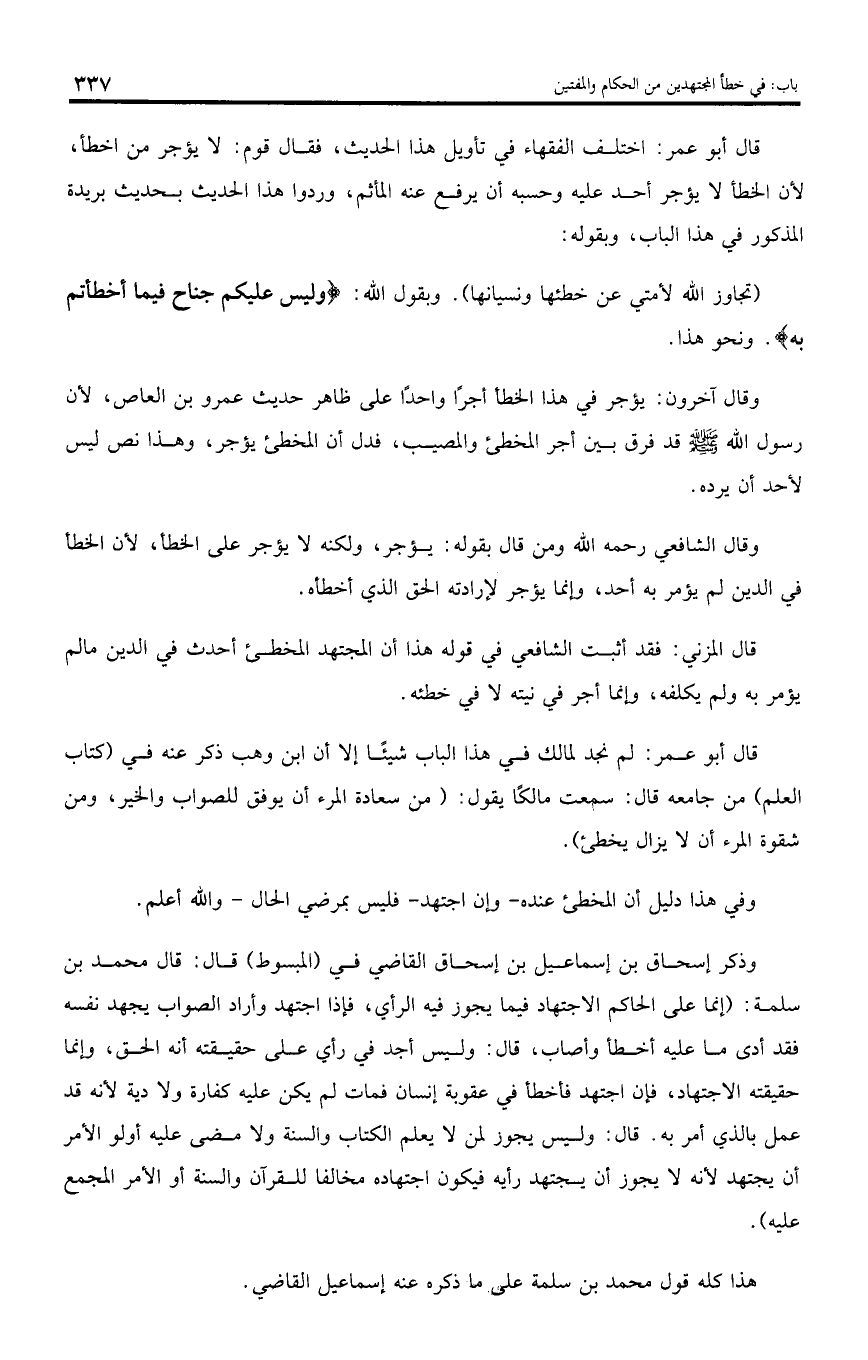 وذكر إسحاق بن إسماعيل بن إسحاق القاضي في (المبسوط) قال: قال محمد بن سلمة: (إنما على الحاكم الاجتهاد فيما يجوز فيه الرأي، فإذا اجتهد وأراد الصواب يجهد نفسه فقد أدى ما عليه أخطأ وأصاب، قال: وليس أجد في رأي على حقيقته أنه الحق، وإنما حقيقته الاجتهاد، فإن اجتهد فأخطأ في عقوبة إنسان فمات لم يكن عليه كفارة ولا دية لأنه قد عمل بالذي أمر به. قال: وليس يجوز لمن لا يعلم الكتاب والسنة ولا مضى عليه أولو الأمر أن يجتهد لأنه لا يجوز أن يجتهد رأيه فيكون اجتهاده مخالفا للقرآن والسنة أو الأمر المجمع عليه).