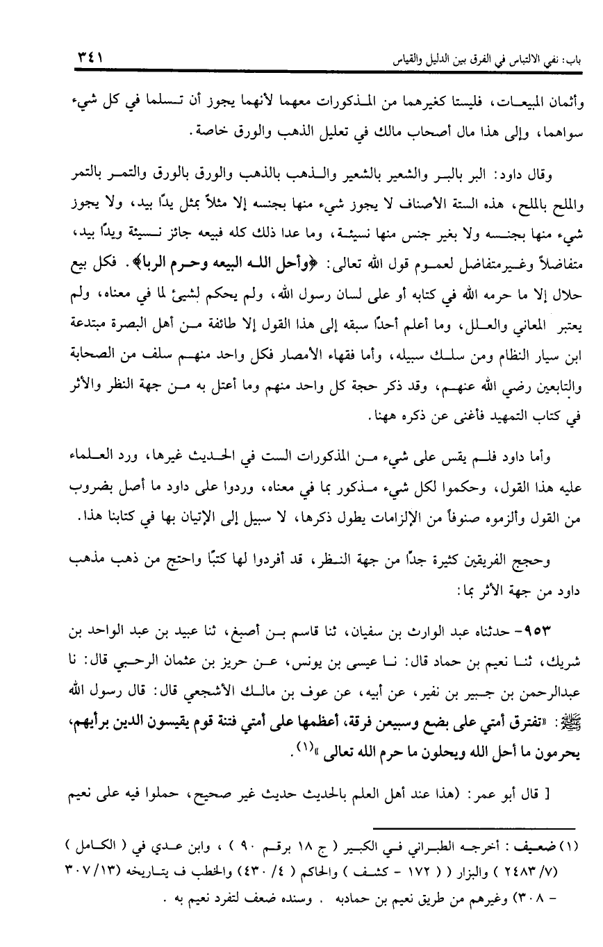 وأما داود فلم يقس على شيء من المذكورات الست في الحديث غيرها، ورد العلماء عليه هذا القول، وحكموا لكل شيء مذكور بما في معناه، وردوا على داود ما أصل بضروب من القول وألزموه صنوفا من الإلزامات يطول ذكرها، لا سبيل إلى الإتيان بها في كتابنا هذا.