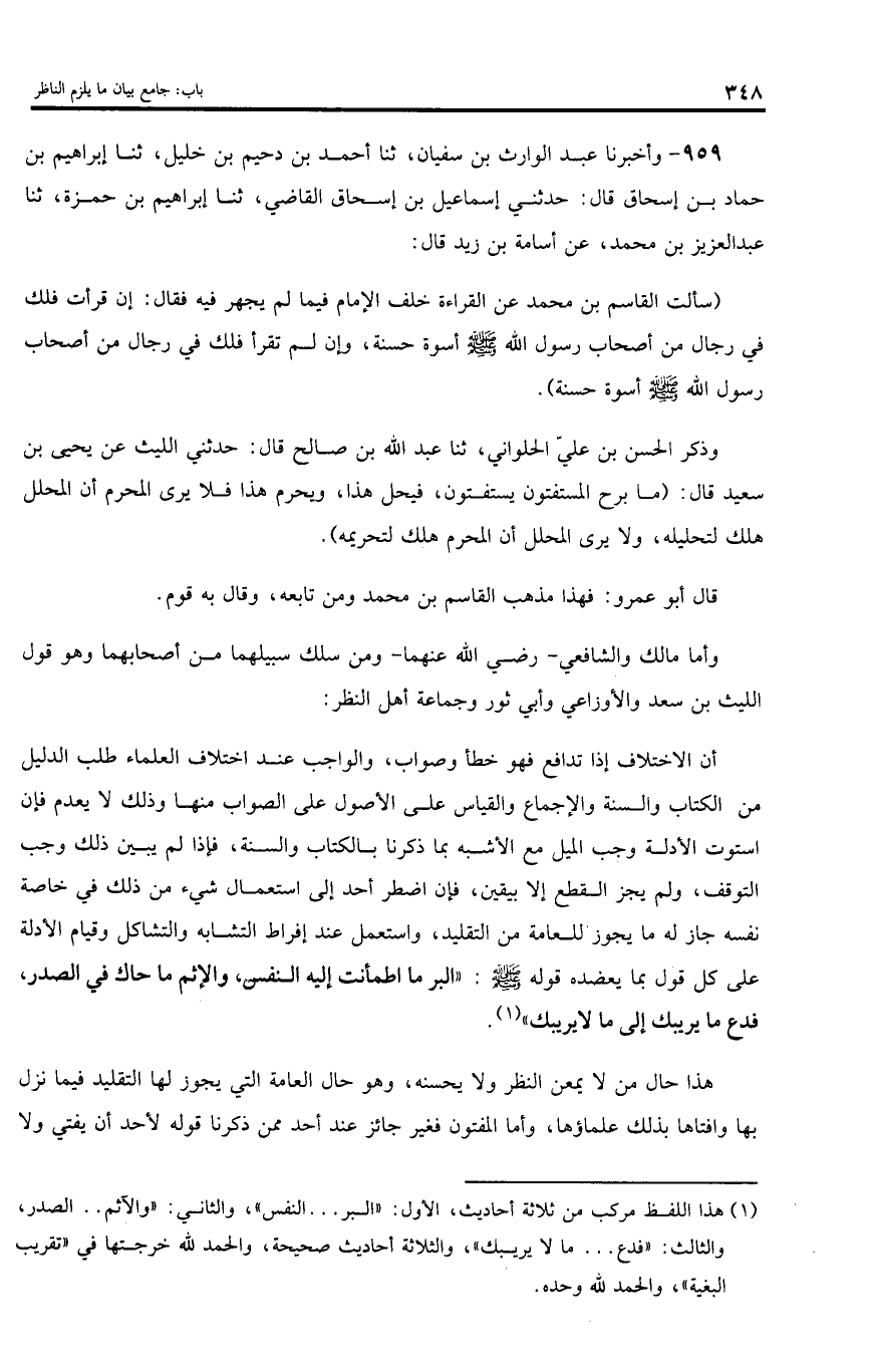 أن الاختلاف إذا تدافع فهو خطأ وصواب، والواجب عند اختلاف العلماء طلب الدليل من الكتاب والسنة والإجماع والقياس على الأصول على الصواب منها وذلك لا يعدم فإن استوت الأدلة وجب الميل مع الأشبه بما ذكرنا بالكتاب والسنة، فإذا لم يبين ذلك وجب التوقف، ولم يجز القطع إلا بيقين، فإن اضطر أحد إلى استعمال شيء من ذلك في خاصة نفسه جاز له ما يجوز للعامة من التقليد، واستعمل عند إفراط التشابه والتشاكل وقيام الأدلة على كل قول بما يعضده قوله صلى اللّه عليه وسلم: «البر ما اطمأنت إليه النفس، والإثم ما حاك في الصدر، فدع ما يريبك إلى ما لا يريبك».