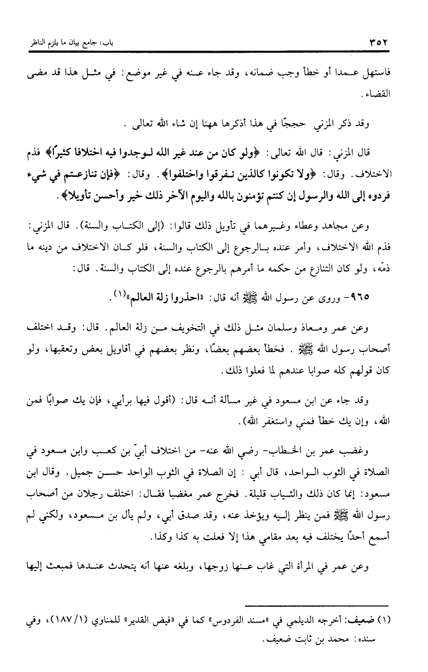 قال المزني: قال اللّه تعالى: (وَلَوْ كانَ مِنْ عِنْدِ غَيْرِ اللَّهِ لَوَجَدُوا فِيهِ اخْتِلافاً كَثِيراً) فذم الاختلاف. وقال: (وَلا تَكُونُوا كَالَّذِينَ تَفَرَّقُوا وَاخْتَلَفُوا)