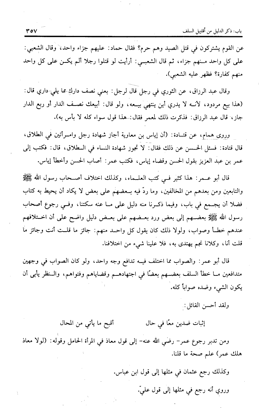 قال أبو عمر: والصواب مما اختلف فيه تدافع وجه واحد، ولو كان الصواب في وجهين متدافعين ما خطأ السلف بعضهم بعضا في اجتهادهم وقضاياهم وفتواهم، والنظر يأبي أن يكون الشيء وضده صوابا كله.