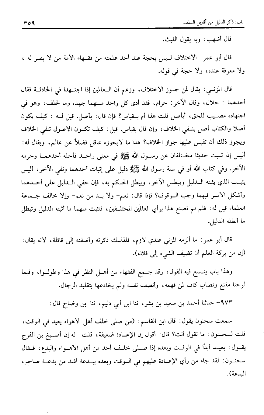 سمعت سحنون يقول: قال ابن القاسم: (من صلى خلف أهل الأهواء يعيد في الوقت، قلت لسحنون: ما تقول أنت؟ قال: أقول إن الإعادة ضعيفة، قلت: له إن أصبغ بن الفرج يقول: يعيد أبدا في الوقت وبعده إذا صلى خلف أحد من أهل الأهواء والبدع، فقال سحنون: لقد جاء من رأي الإعادة عليهم في الوقت وبعده ببدعة أشد من بدعة صاحب البدعة).