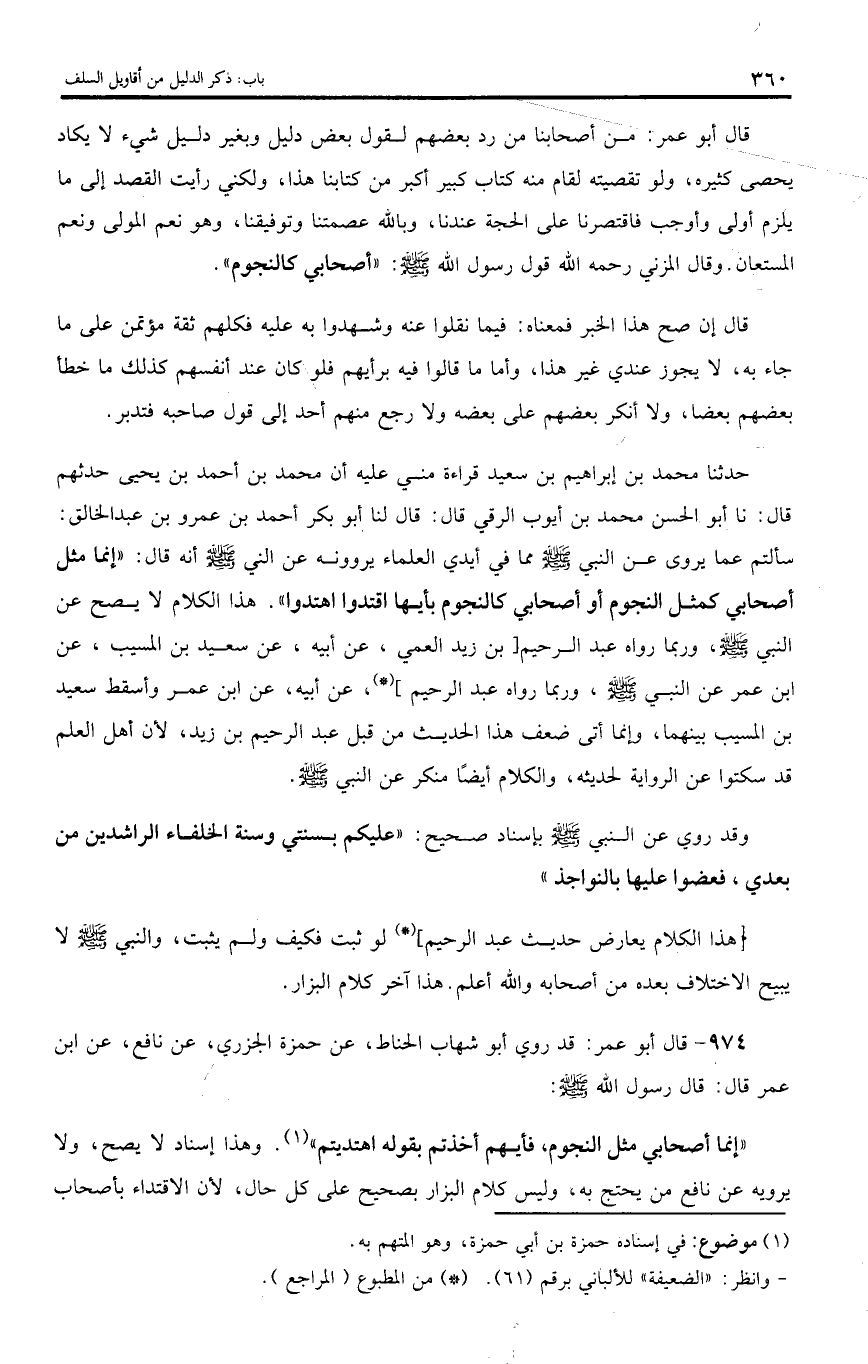 974 - قال أبو عمر: قد روي أبو شهاب الحناط، عن حمزة الجزري، عن نافع، عن ابن عمر قال: قال رسول اللّه صلى اللّه عليه وسلم: «إنما أصحابي مثل النجوم، فأيهم أخذتم بقوله اهتديتم». وهذا إسناد لا يصح، ولا يرويه عن نافع من يحتج به، وليس كلام البزار بصحيح على كل حال، لأن الاقتداء بأصحاب