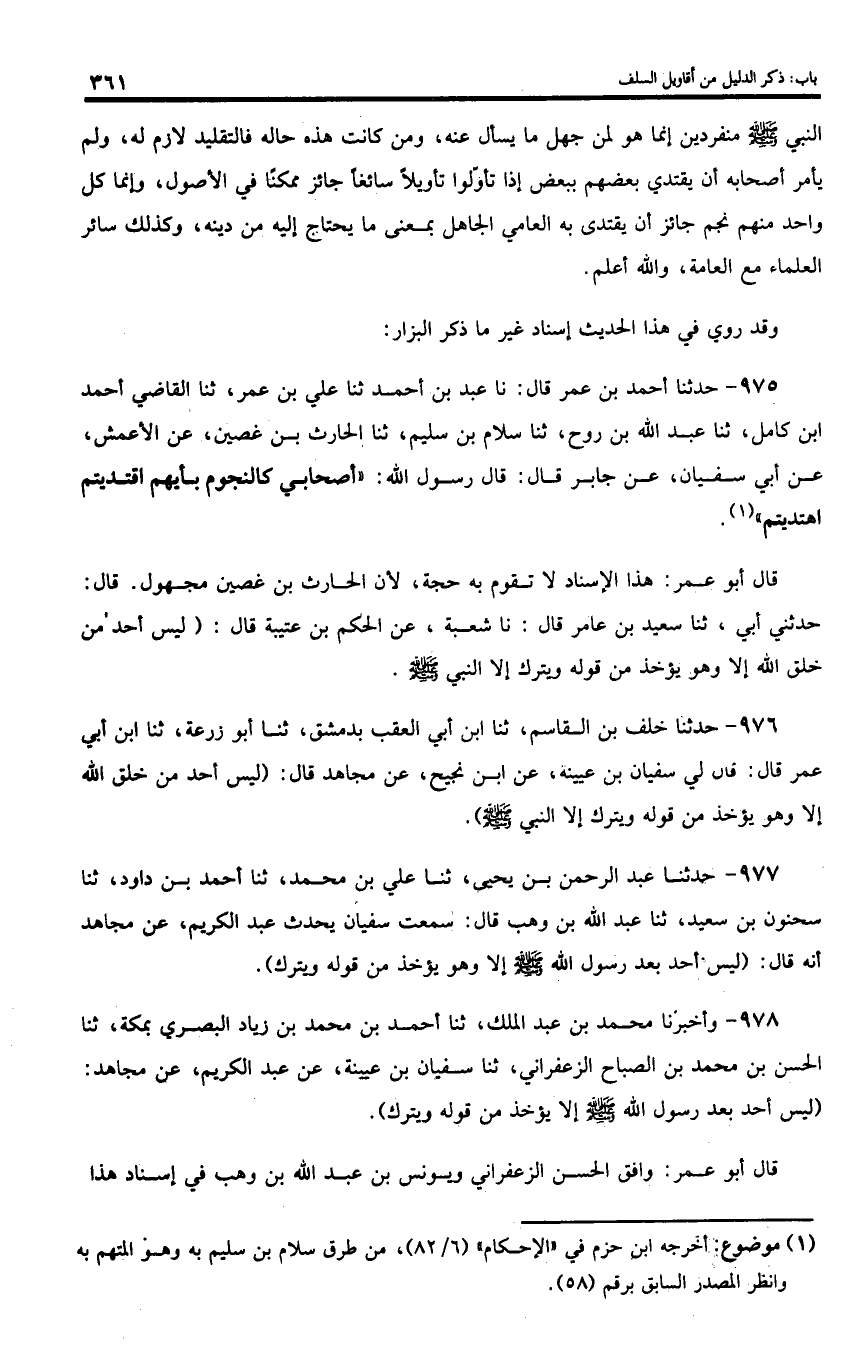 975 - حدثنا أحمد بن عمر قال: نا عبد بن أحمد ثنا علي بن عمر، ثنا القاضي أحمد ابن كامل، ثنا عبد اللّه بن روح، ثنا سلام بن سليم، ثنا الحارث بن غصين، عن الأعمش، عن أبي سفيان، عن جابر قال: قال رسول اللّه: «أصحابي كالنجوم بأيهم اقتديتم اهتديتم».