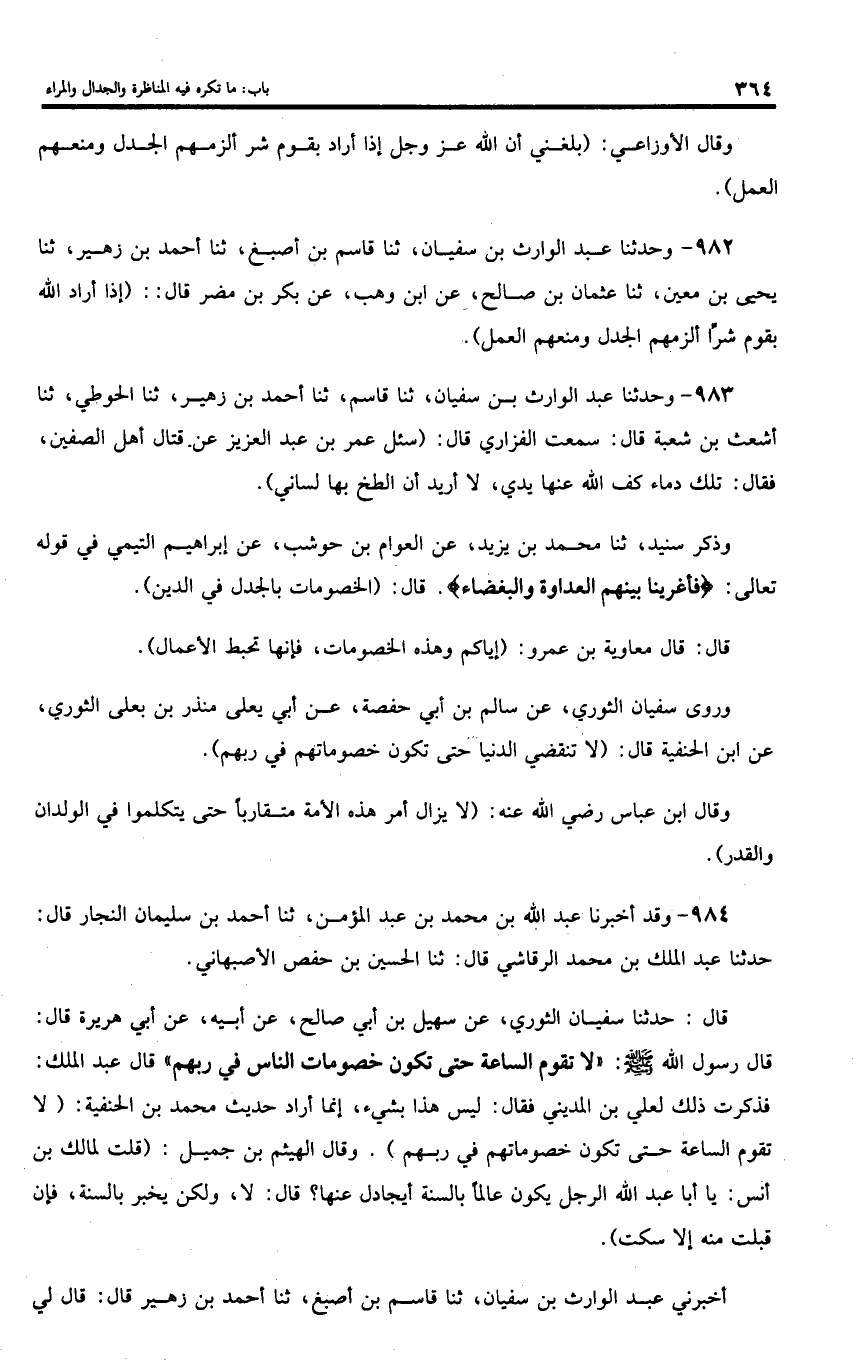 982 - وحدثنا عبد الوارث بن سفيان، ثنا قاسم بن أصبغ، ثنا أحمد بن زهير، ثنا يحيى بن معين، ثنا عثمان بن صالح، عن ابن وهب، عن بكر بن مضر قال: (إذا أراد اللّه بقوم شرّا ألزمهم الجدل ومنعهم العمل).