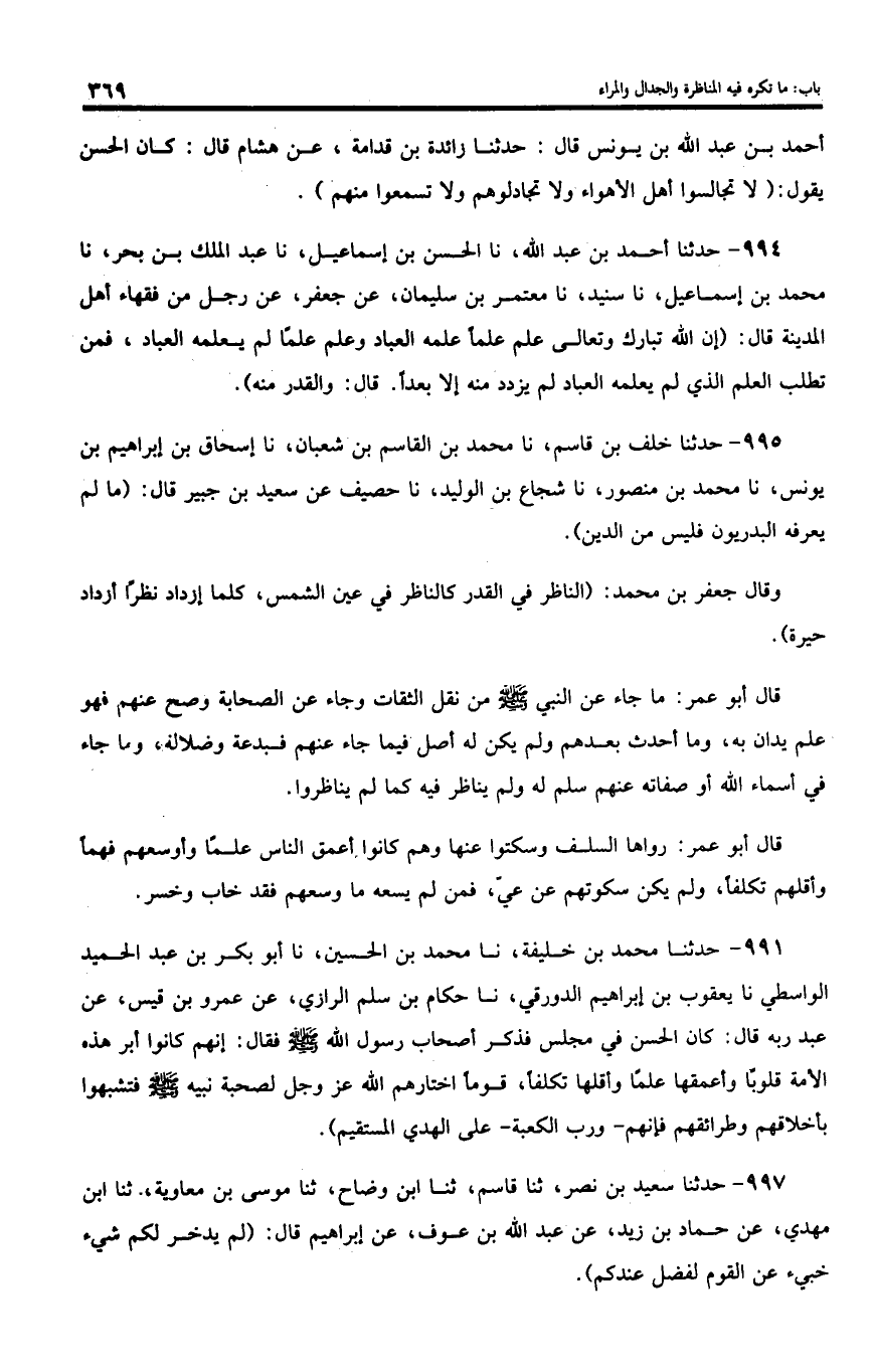 995 - حدثنا خلف بن قاسم، نا محمد بن القاسم بن شعبان، نا إسحاق بن إبراهيم بن يونس، نا محمد بن منصور، نا شجاع بن الوليد، نا حصيف عن سعيد بن جبير قال: (ما لم يعرفه البدريون فليس من الدين).