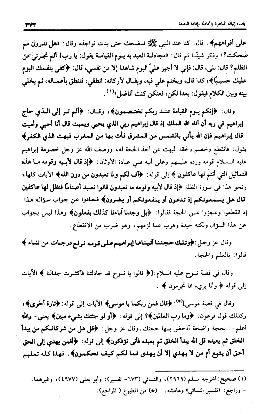 وقال: (إِنَّكُمْ يَوْمَ الْقِيامَةِ عِنْدَ رَبِّكُمْ تَخْتَصِمُونَ)، وقال: (أَلَمْ تَرَ إِلَى الَّذِي حَاجَّ إِبْراهِيمَ فِي رَبِّهِ أَنْ آتاهُ اللَّهُ الْمُلْكَ إِذْ قالَ إِبْراهِيمُ رَبِّيَ الَّذِي يُحْيِي وَيُمِيتُ قالَ أَنَا أُحْيِي وَأُمِيتُ قالَ إِبْراهِيمُ فَإِنَّ اللَّهَ يَاتِي بِالشَّمْسِ مِنَ الْمَشْرِقِ فَاتِ بِها مِنَ الْمَغْرِبِ فَبُهِتَ الَّذِي كَفَرَ)