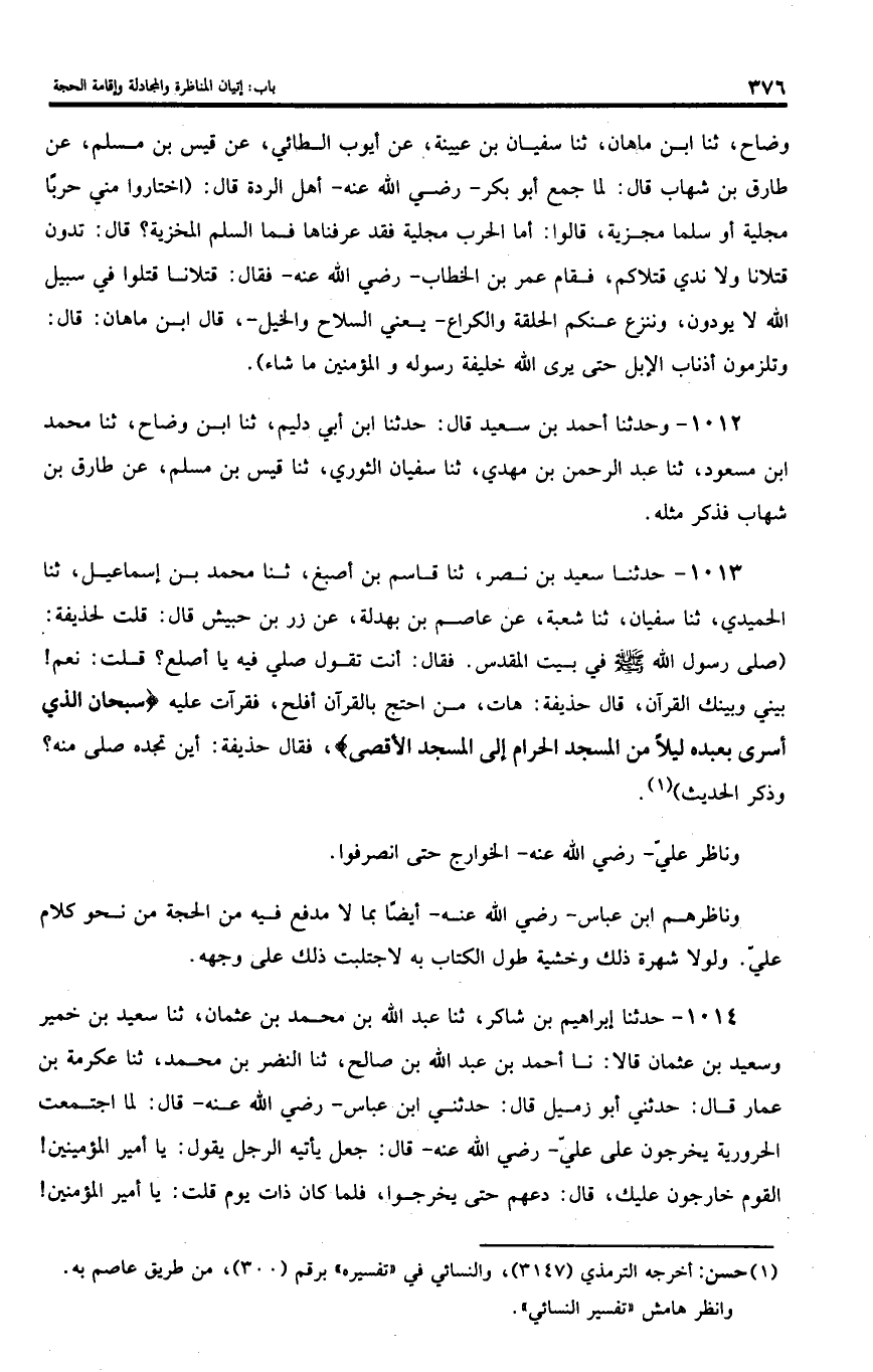 1012 - وحدثنا أحمد بن سعيد قال: حدثنا ابن أبي دليم، ثنا ابن وضاح، ثنا محمد ابن مسعود، ثنا عبد الرحمن بن مهدي، ثنا سفيان الثوري، ثنا قيس بن مسلم، عن طارق بن شهاب فذكر مثله.