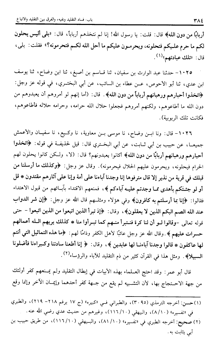1026 - قال: ونا ابن وضاح، نا موسى بن معاوية، نا وكيع، نا سفيان والأعمش جميعا، عن حبيب بن أبي ثابت، عن أبي البختري قال: قيل لحذيفة في قوله: اتَّخَذُوا أَحْبارَهُمْ وَرُهْبانَهُمْ أَرْباباً مِنْ دُونِ اللَّهِ ... أكانوا يعبدونهم؟ قال: (لا، ولكن كانوا يحلون لهم الحرام فيحلونه، ويحرمون عليهم الحلال فيحرمونه). وقال عز وجل: وَكَذلِكَ ما أَرْسَلْنا مِنْ قَبْلِكَ فِي قَرْيَةٍ مِنْ نَذِيرٍ إِلَّا قالَ مُتْرَفُوها إِنَّا وَجَدْنا آباءَنا عَلى أُمَّةٍ وَإِنَّا عَلى آثارِهِمْ مُقْتَدُونَ* قالَ أَ وَلَوْ جِئْتُكُمْ بِأَهْدى مِمَّا وَجَدْتُمْ عَلَيْهِ آباءَكُمْ، فمنعهم الاقتداء بآبائهم من قبول الاهتداء فقالوا: إِنَّا بِما أُرْسِلْتُمْ بِهِ كافِرُونَ