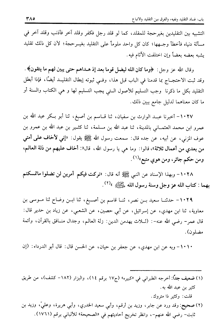 وقد ثبت الاحتجاج بما قدمنا في الباب قبل هذا، وفي ثبوته إبطال التقليد أيضا، فإذا أبطل التقليد بكل ما ذكرنا وجب التسليم للأصول التي يجب التسليم لها وهي الكتاب والسنة أو ما كان معناهما لدليل جامع يبين ذلك.