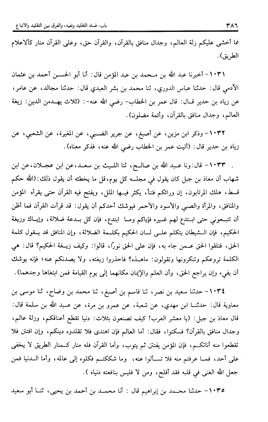 1034 - حدثنا سعيد بن نصر، ثنا قاسم بن أصبغ، ثنا محمد بن وضاح، ثنا موسى بن معاوية قال: حدثنا ابن مهدي، عن شعبة، عن عمرو بن مرة، عن عبد اللّه بن سلمة قال: قال معاذ بن جبل: (يا معشر العرب! كيف تصنعون بثلاث: دنيا تقطع أعناقكم، وزلة عالم، وجدال منافق بالقرآن؟ فسكتوا، فقال: أما العالم فإن اهتدى فلا تقلدوه دينكم، وإن افتتن فلا تقطعوا منه أناتكم، فإن المؤمن يفتتن ثم يتوب، وأما القرآن فله منار كمنار الطريق لا يخفى على أحد، فما عرفتم منه فلا تسألوا عنه، وما شككتم فكلوه إلى عالمه، وأما الدنيا فمن جعل اللّه الغنى في قلبه فقد أفلح، ومن لا فليس بنافعته دنياه).