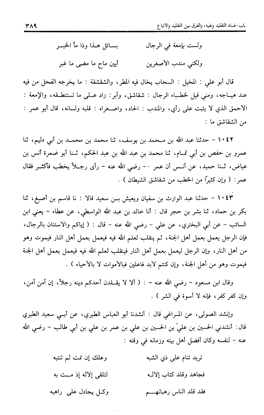 1042 - حدثنا عبد اللّه بن محمد بن يوسف، ثنا محمد بن محمد بن أبي دليم، ثنا عمرو بن حفص بن أبي تمام، ثنا محمد بن عبد اللّه بن عبد الحكم، ثنا أبو ضمرة أنس بن عياض، ثنا حميد، عن أنس أن عمر.- رضي اللّه عنه - رأى رجلا يخطب فأكثر فقال عمر: (و إن كثيرا من الخطب من شقاشق الشيطان).