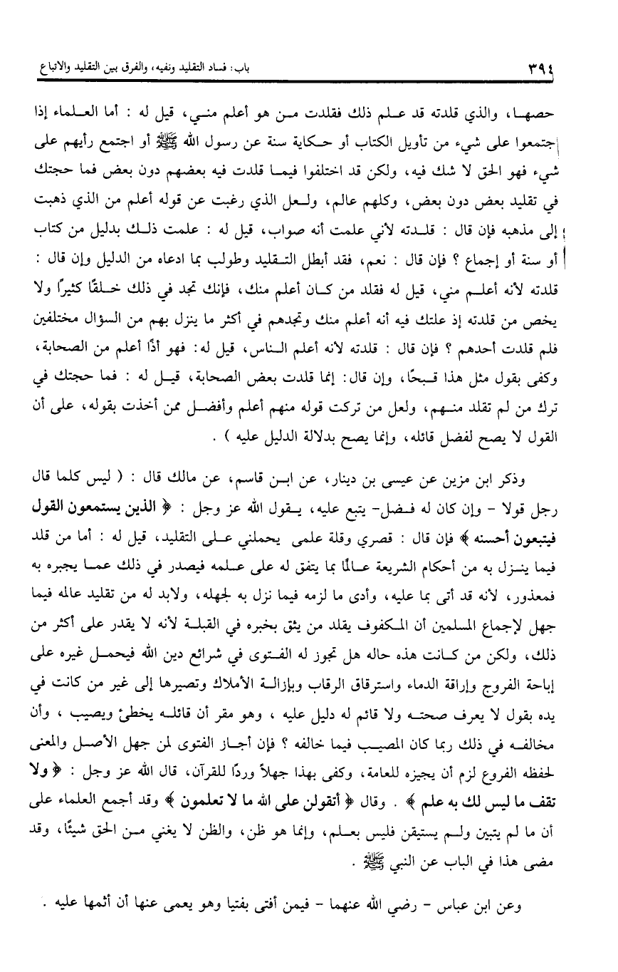 وذكر ابن مزين عن عيسى بن دينار، عن ابن قاسم، عن مالك قال: (ليس كلما قال رجل قولا - وإن كان له فضل - يتبع عليه، يقول اللّه عز وجل: الَّذِينَ يَسْتَمِعُونَ الْقَوْلَ فَيَتَّبِعُونَ أَحْسَنَهُ