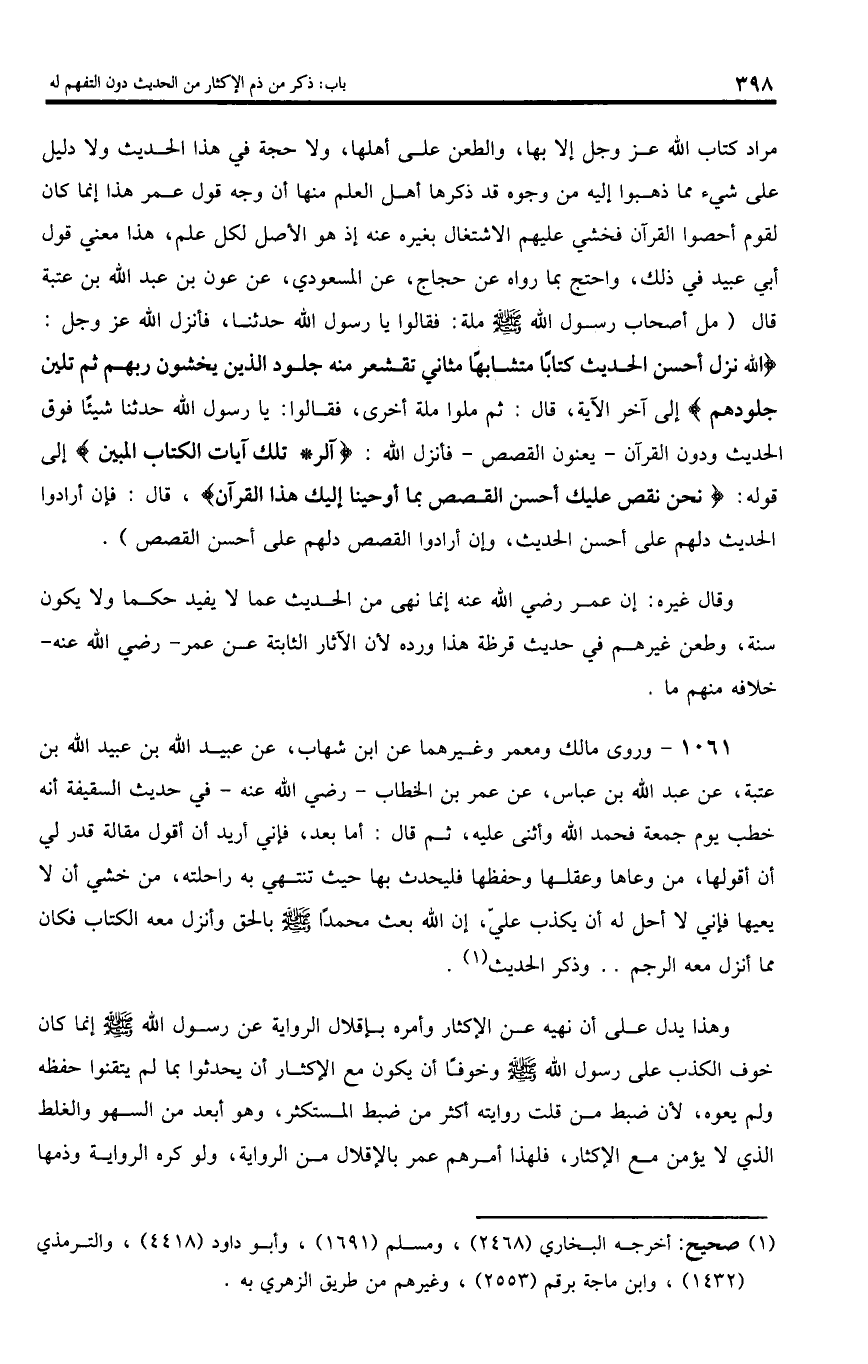 مراد كتاب اللّه عز وجل إلا بها، والطعن على أهلها، ولا حجة في هذا الحديث ولا دليل على شيء مما ذهبوا إليه من وجوه قد ذكرها أهل العلم منها أن وجه قول عمر هذا إنما كان لقوم أحصوا القرآن فخشي عليهم الاشتغال بغيره عنه إذ هو الأصل لكل علم، هذا معني قول أبي عبيد في ذلك، واحتج بما رواه عن حجاج، عن المسعودي، عن عون بن عبد اللّه بن عتبة قال (مل أصحاب رسول اللّه صلى اللّه عليه وسلم ملة: فقالوا يا رسول اللّه حدثنا، فأنزل اللّه عز وجل: اللَّهُ نَزَّلَ أَحْسَنَ الْحَدِيثِ كِتاباً مُتَشابِهاً مَثانِيَ تَقْشَعِرُّ مِنْهُ جُلُودُ الَّذِينَ يَخْشَوْنَ رَبَّهُمْ ثُمَّ تَلِينُ جُلُودُهُمْ إلى آخر الآية، قال: ثم ملوا ملة أخرى، فقالوا: يا رسول اللّه حدثنا شيئا فوق الحديث ودون القرآن - يعنون القصص - فأنزل اللّه: الر* تِلْكَ آياتُ الْكِتابِ الْمُبِينِ إلى قوله: نَحْنُ نَقُصُّ عَلَيْكَ أَحْسَنَ الْقَصَصِ بِما أَوْحَيْنا إِلَيْكَ هذَا الْقُرْآنَ، قال: فإن أرادوا الحديث دلهم على أحسن الحديث، وإن أرادوا القصص دلهم على أحسن القصص).