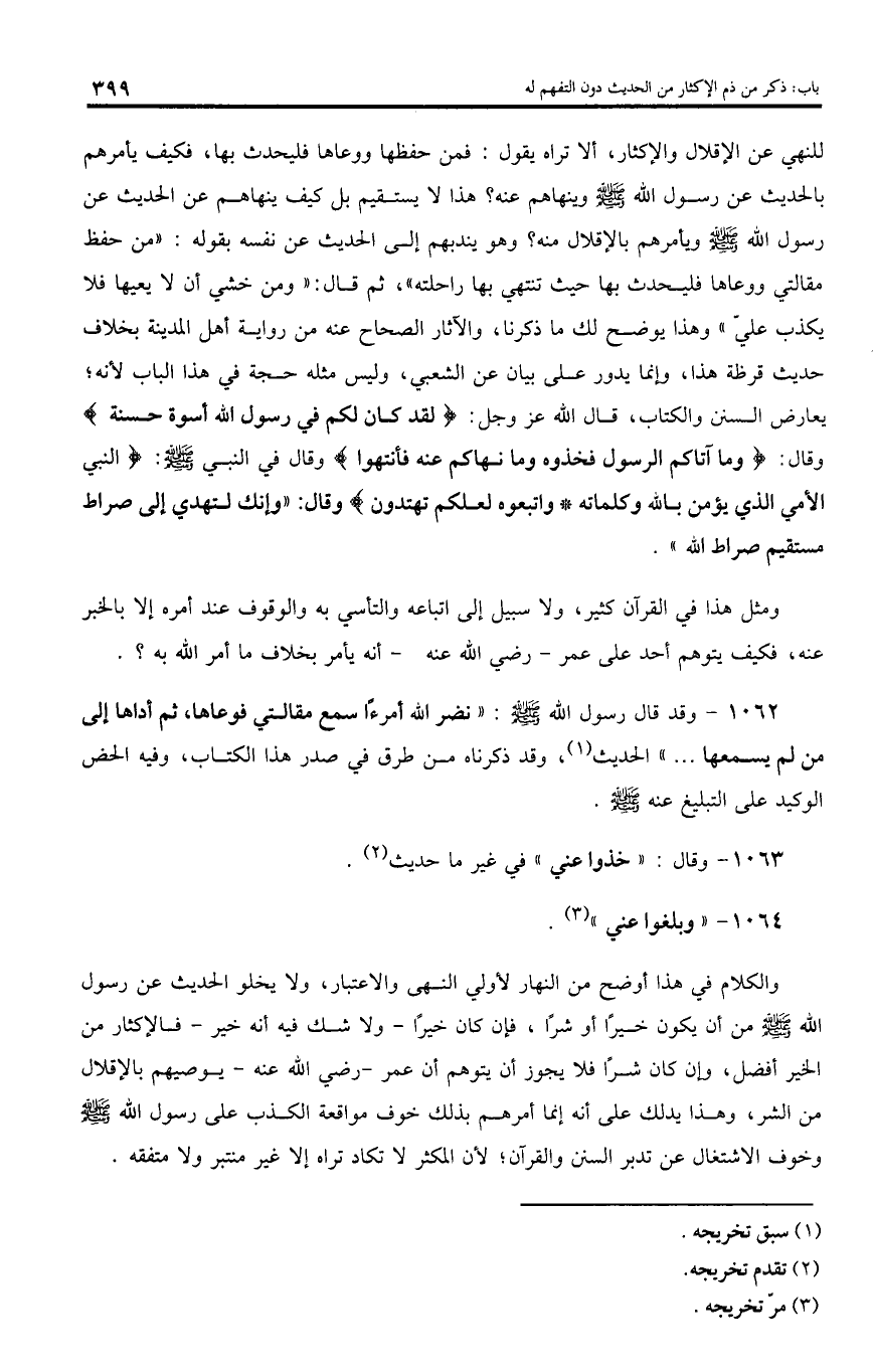 والكلام في هذا أوضح من النهار لأولي النهى والاعتبار، ولا يخلو الحديث عن رسول اللّه صلى اللّه عليه وسلم من أن يكون خيرا أو شرا، فإن كان خيرا - ولا شك فيه أنه خير - فالإكثار من الخير أفضل، وإن كان شرا فلا يجوز أن يتوهم أن عمر - رضي اللّه عنه - يوصيهم بالإقلال من الشر، وهذا يدلك على أنه إنما أمرهم بذلك خوف مواقعة الكذب على رسول اللّه صلى اللّه عليه وسلم وخوف الاشتغال عن تدبر السنن والقرآن؛ لأن المكثر لا تكاد تراه إلا غير منتبر ولا متفقه.