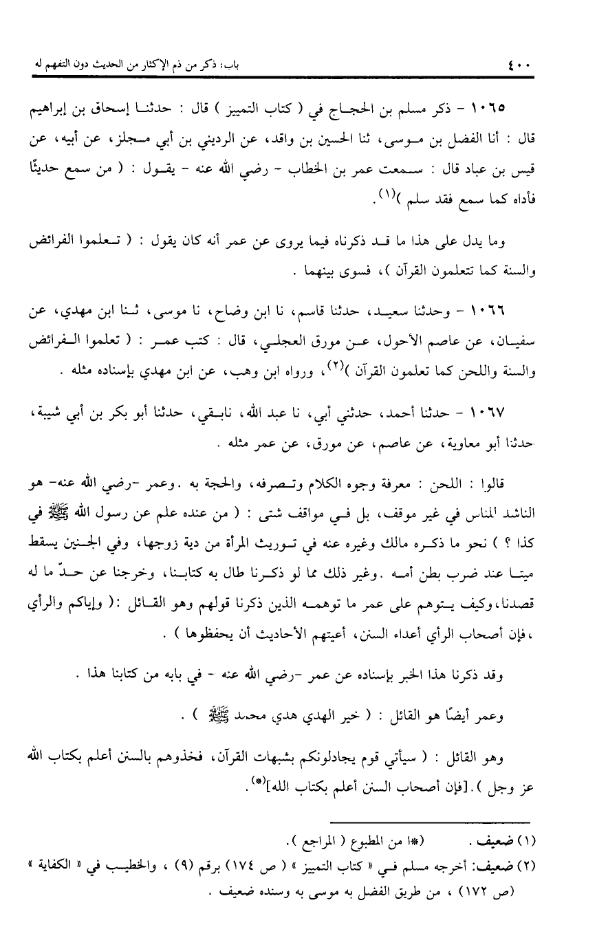 1065 - ذكر مسلم بن الحجاج في (كتاب التمييز) قال: حدثنا إسحاق بن إبراهيم قال: أنا الفضل بن موسى، ثنا الحسين بن واقد، عن الرديني بن أبي مجلز، عن أبيه، عن قيس بن عباد قال: سمعت عمر بن الخطاب - رضي اللّه عنه - يقول: (من سمع حديثا فأداه كما سمع فقد سلم).