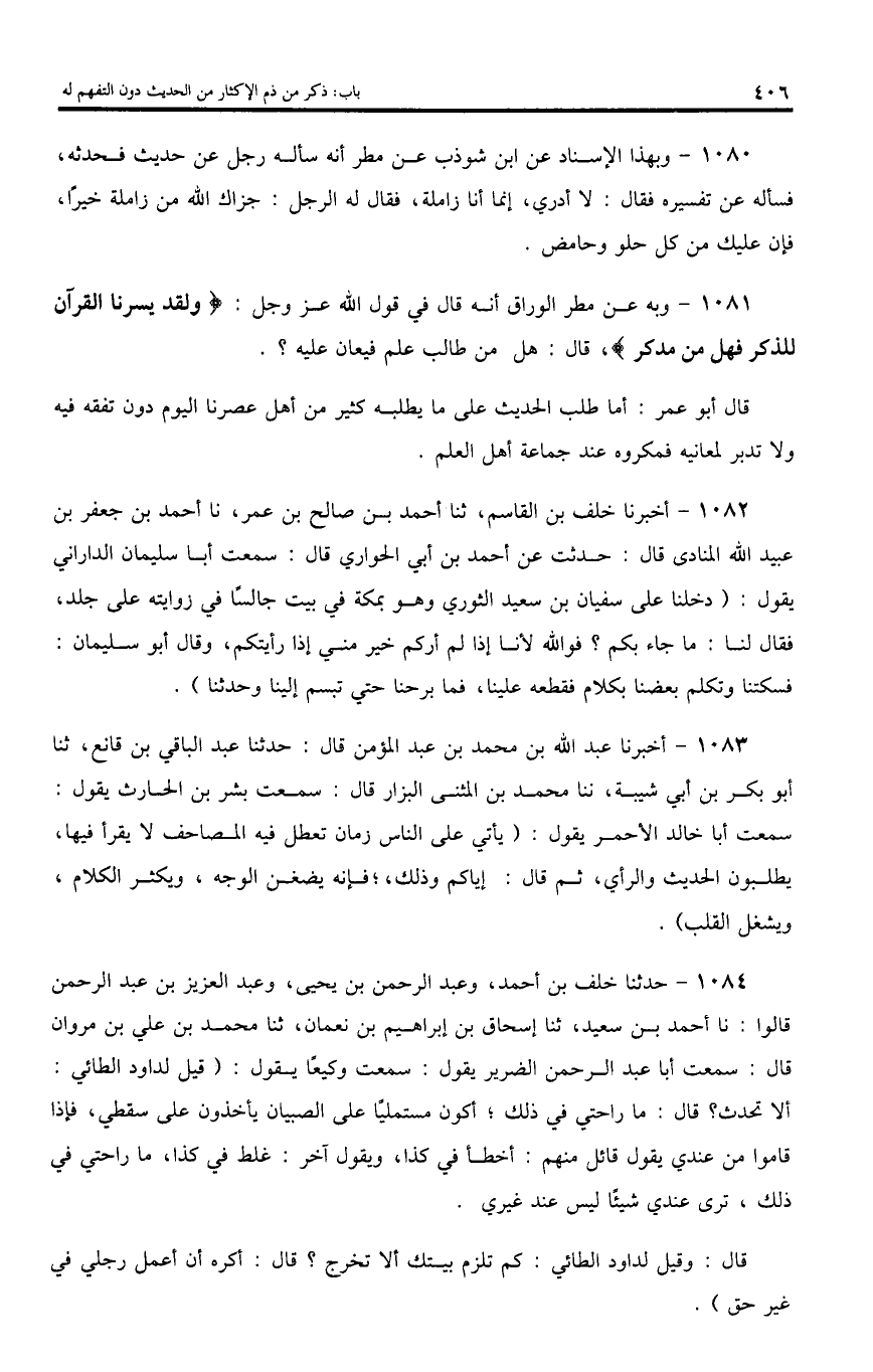 1084 - حدثنا خلف بن أحمد، وعبد الرحمن بن يحيى، وعبد العزيز بن عبد الرحمن قالوا: نا أحمد بن سعيد، ثنا إسحاق بن إبراهيم بن نعمان، ثنا محمد بن علي بن مروان قال: سمعت أبا عبد الرحمن الضرير يقول: سمعت وكيعا يقول: (قيل لداود الطائي: