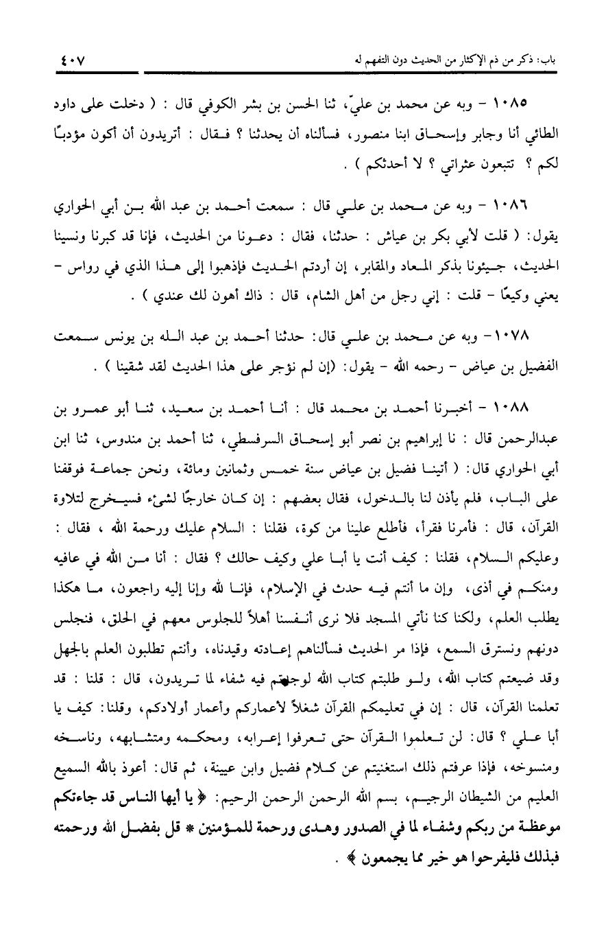 1078 - وبه عن محمد بن علي قال: حدثنا أحمد بن عبد اللّه بن يونس سمعت الفضيل بن عياض - رحمه اللّه - يقول: (إن لم نؤجر على هذا الحديث لقد شقينا).