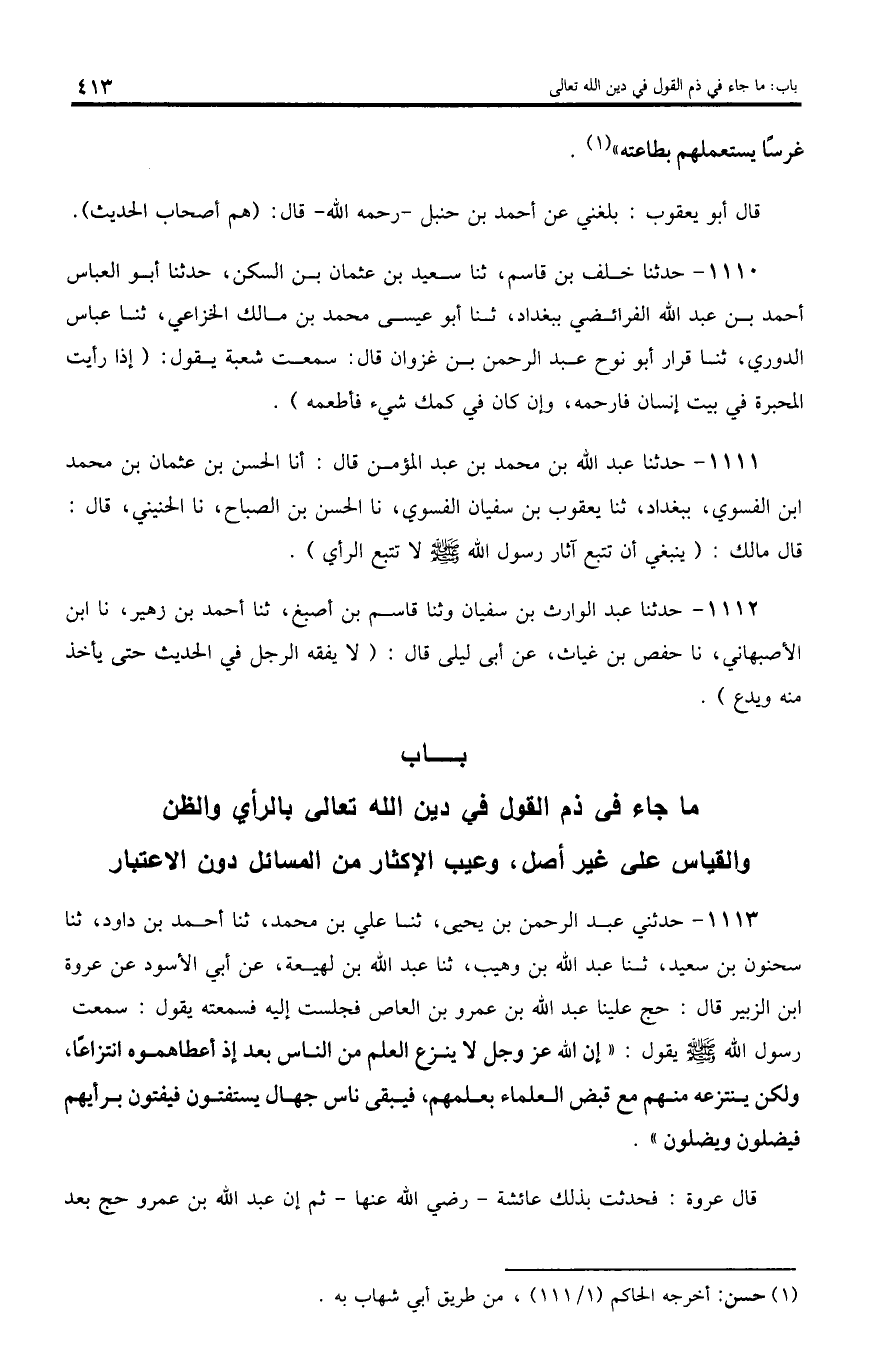 1113 - حدثني عبد الرحمن بن يحيى، ثنا علي بن محمد، ثنا أحمد بن داود، ثنا سحنون بن سعيد، ثنا عبد اللّه بن وهيب، ثنا عبد اللّه بن لهيعة، عن أبي الأسود عن عروة ابن الزبير قال: حج علينا عبد اللّه بن عمرو بن العاص فجلست إليه فسمعته يقول: سمعت رسول اللّه صلى اللّه عليه وسلم يقول: «إن اللّه عز وجل لا ينزع العلم من الناس بعد إذ أعطاهموه انتزاعا، ولكن ينتزعه منهم مع قبض العلماء بعلمهم، فيبقى ناس جهال يستفتون فيفتون برأيهم فيضلون ويضلون».