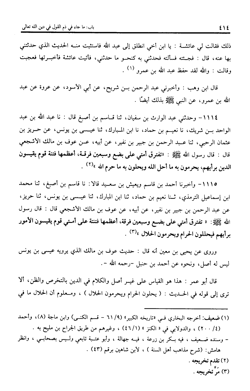1114 - وحدثني عبد الوارث بن سفيان، ثنا قاسم بن أصبغ قال: نا عبد اللّه بن عبد الواحد بن شريك، نا نعيم بن حماد، نا ابن المبارك، ثنا عيسى بن يونس، عن حريز بن عثمان الرحبي، ثنا عبد الرحمن بن جبير بن نفير، عن أبيه، عن عوف بن مالك الأشجعي قال: قال رسول اللّه صلى اللّه عليه وسلم: «تفترق أمتي على بضع وسبعين فرقة، أعظمها فتنة قوم يقيسون الدين برأيهم، يحرمون به ما أحل اللّه ويحلون به ما حرم اللّه».