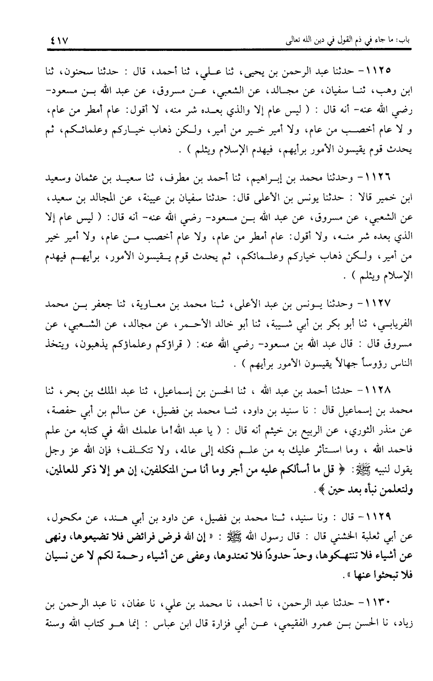 1125 - حدثنا عبد الرحمن بن يحيى، ثنا علي، ثنا أحمد، قال: حدثنا سحنون، ثنا ابن وهب، ثنا سفيان، عن مجالد، عن الشعبي، عن مسروق، عن عبد اللّه بن مسعود - رضي اللّه عنه - أنه قال: (ليس عام إلا والذي بعده شر منه، لا أقول: عام أمطر من عام، ولا عام أخصب من عام، ولا أمير خير من أمير، ولكن ذهاب خياركم وعلمائكم، ثم يحدث قوم يقيسون الأمور برأيهم، فيهدم الإسلام ويثلم).